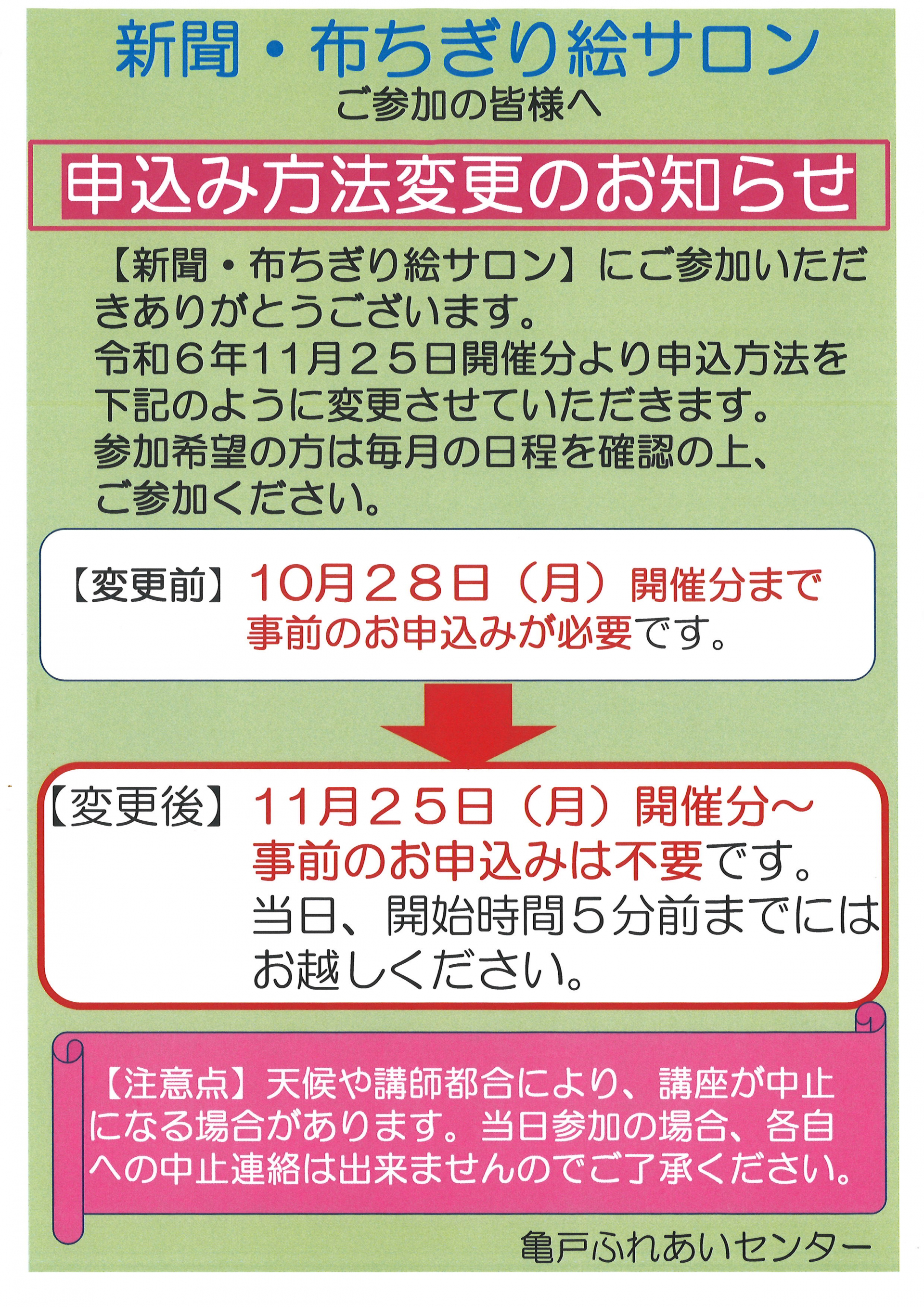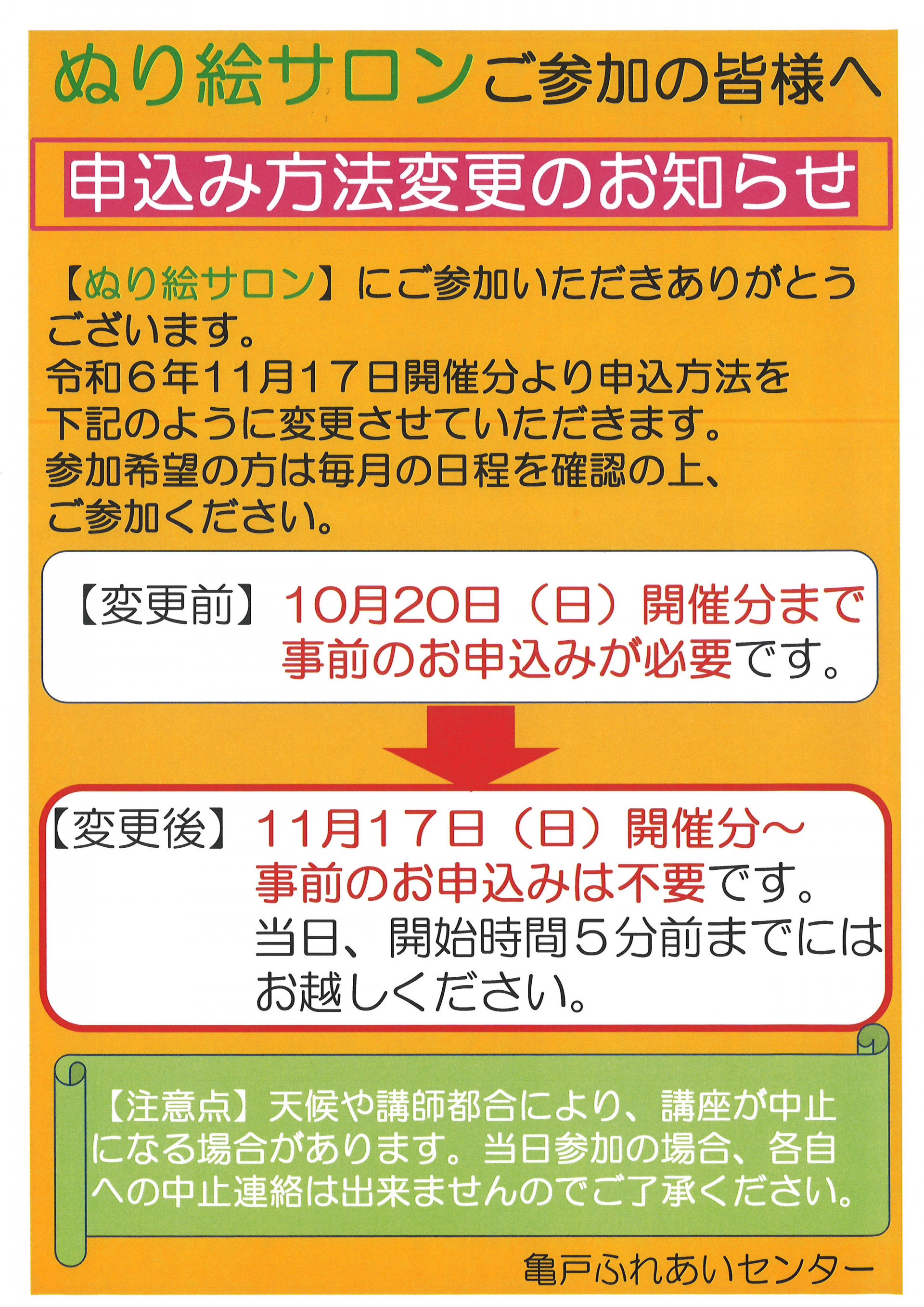 11月~【下町舞踊・ぬり絵サロン・ちぎり絵サロン】の3講座に関しては、事前のお申し込みは不要となり当日自由参加となります。