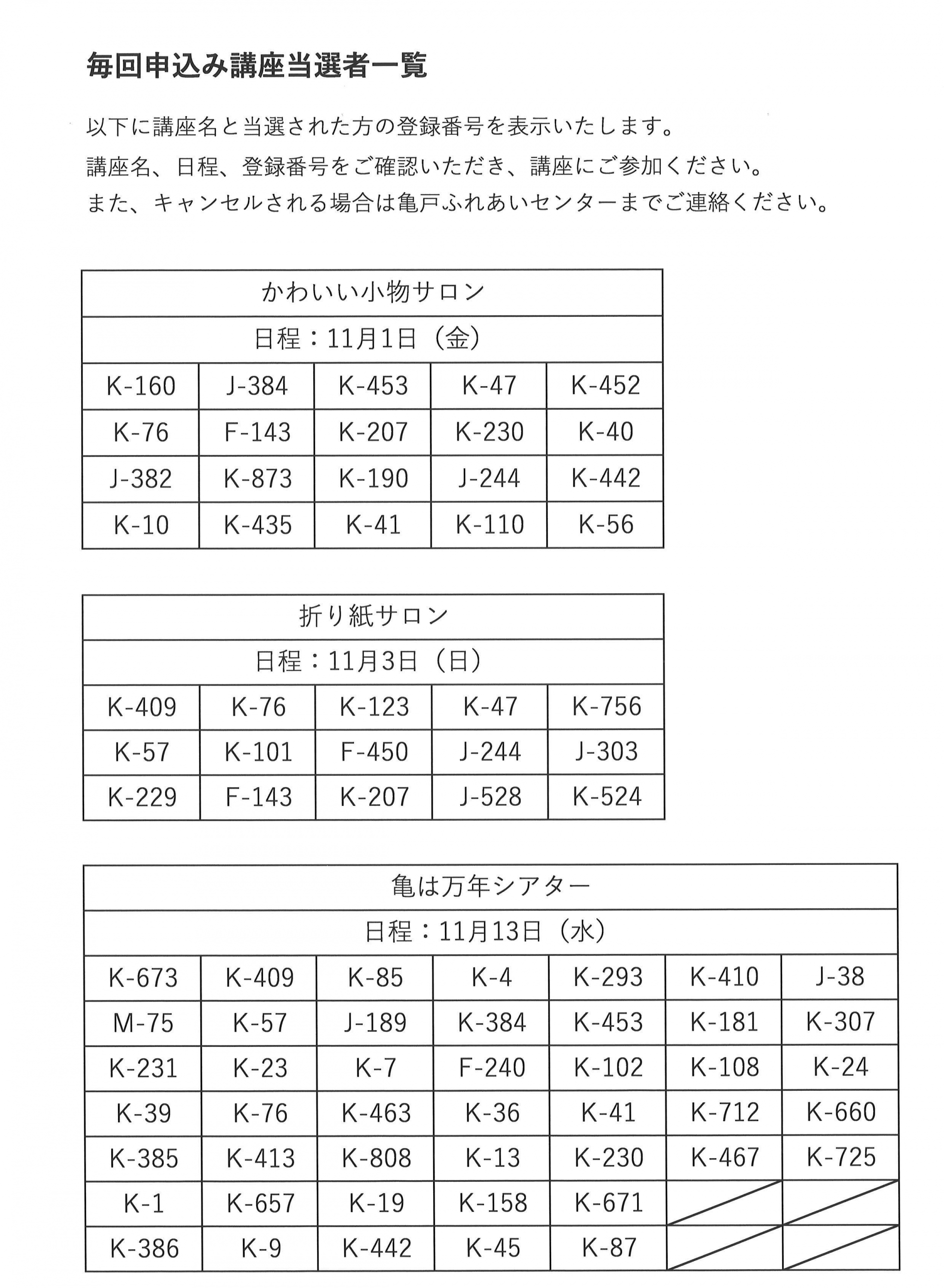 11月前半開催の毎回申込み講座の当選発表をいたします。