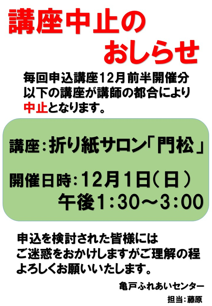 12月1日(日)に開催予定だった以下の講座が講師の都合により、中止にすることを決定いたしました。
