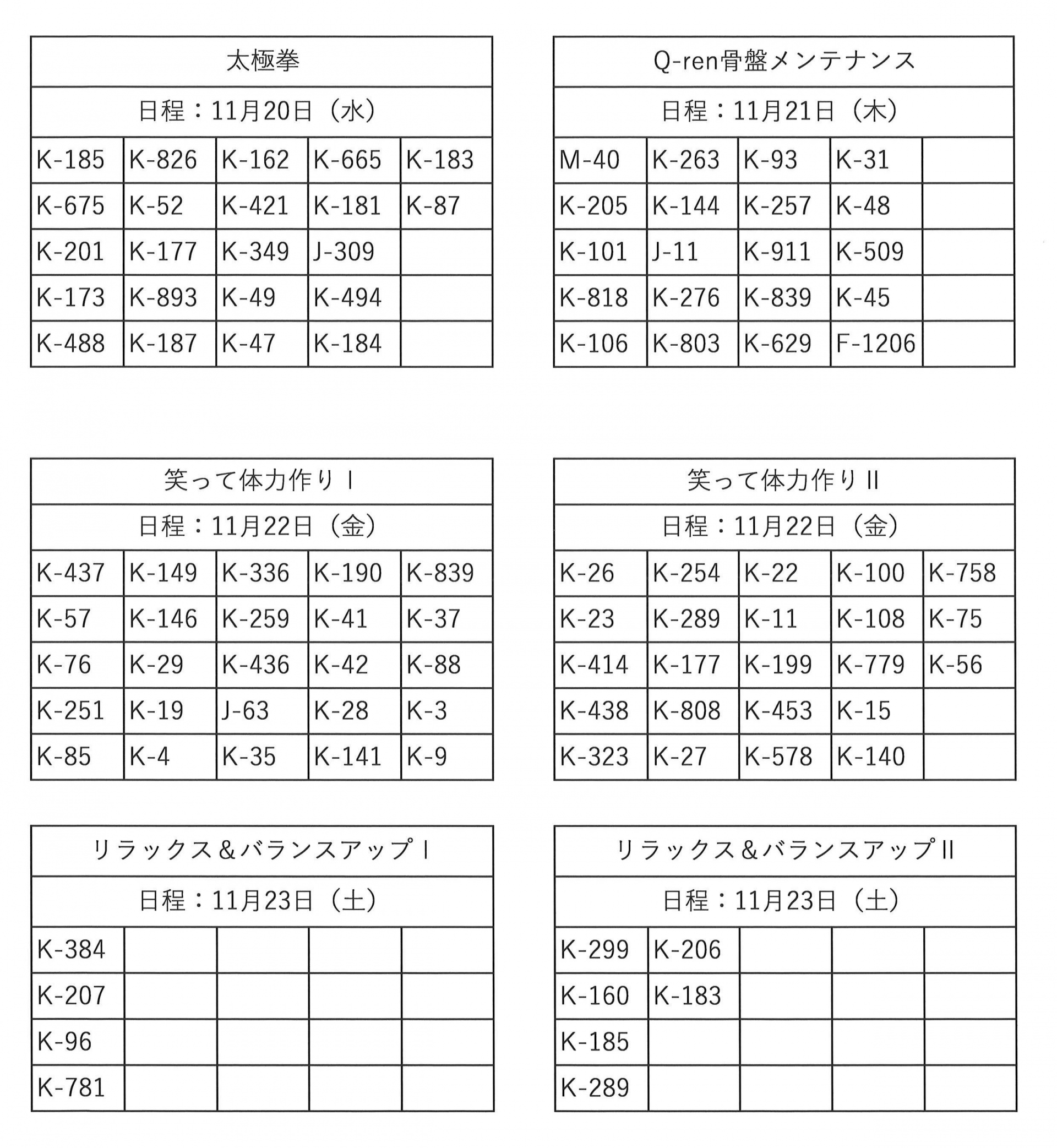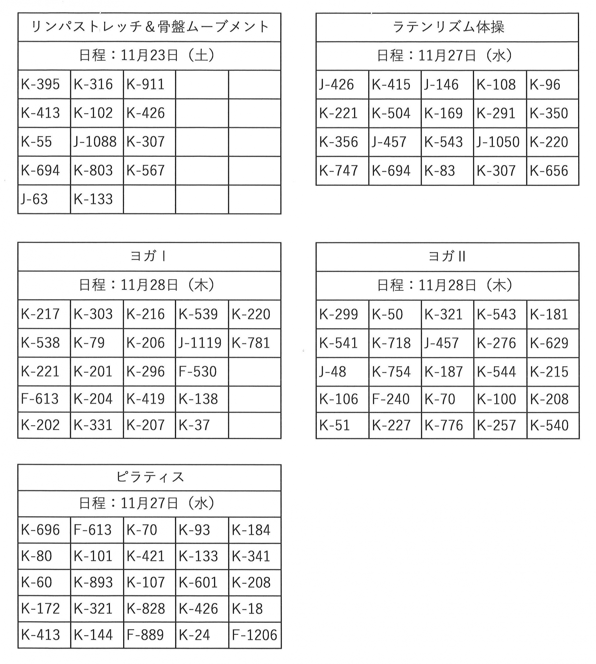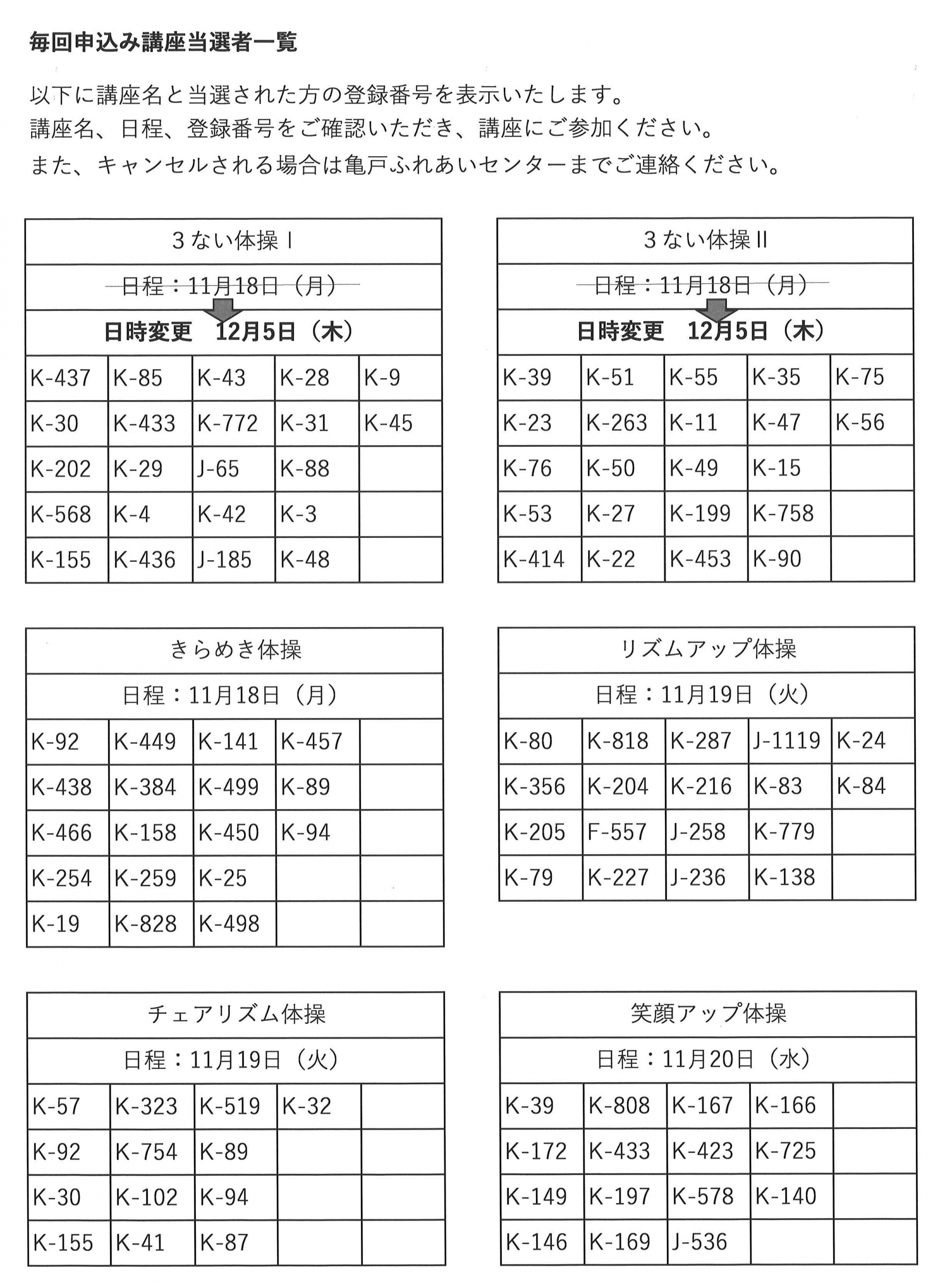 11月後半開催毎回申込講座 当選連絡その1【体操講座】
