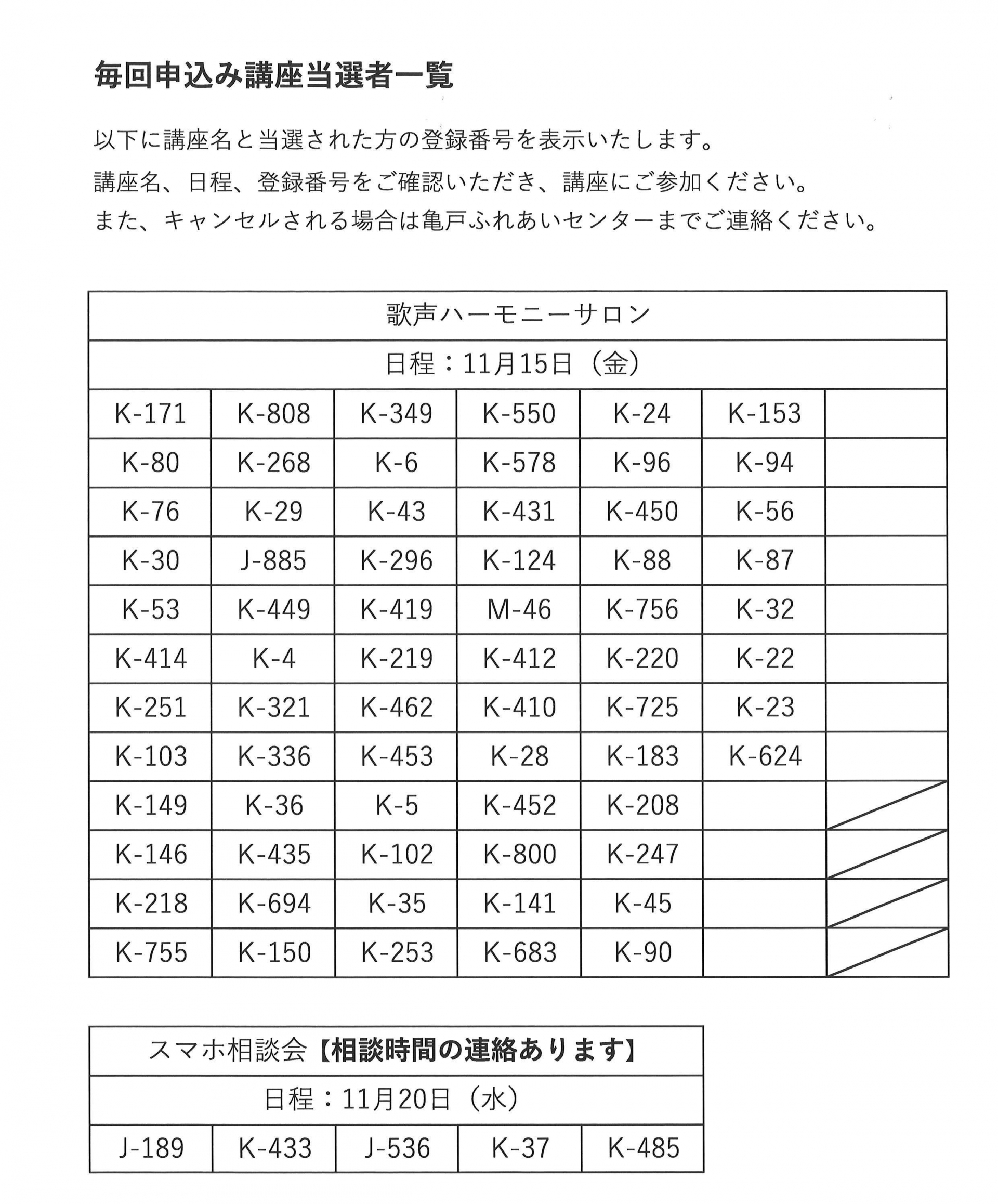 11月後半開催の毎回申込み講座の当選発表をいたします。