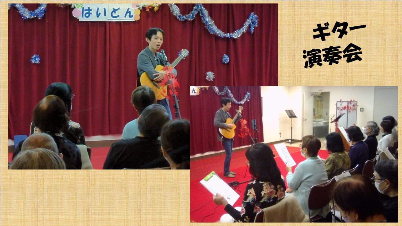 続いての2部は、はいどん氏による秋のふれあいギター演奏会です。皆さんが知っている懐かしい5曲(見上げてごらん夜の星を・ルパン三世のテーマなど)をアレンジして演奏、オリジナルの2曲を披露していただきオリジナル曲セツナは心に響いたと好評でした。トークもおもしろく演奏も素晴らしかったはいどん氏の演奏に合わせて、皆さんと川の流れのようにを歌い楽しい時間を過しました。はいどん氏有難う御座いました(^^♪