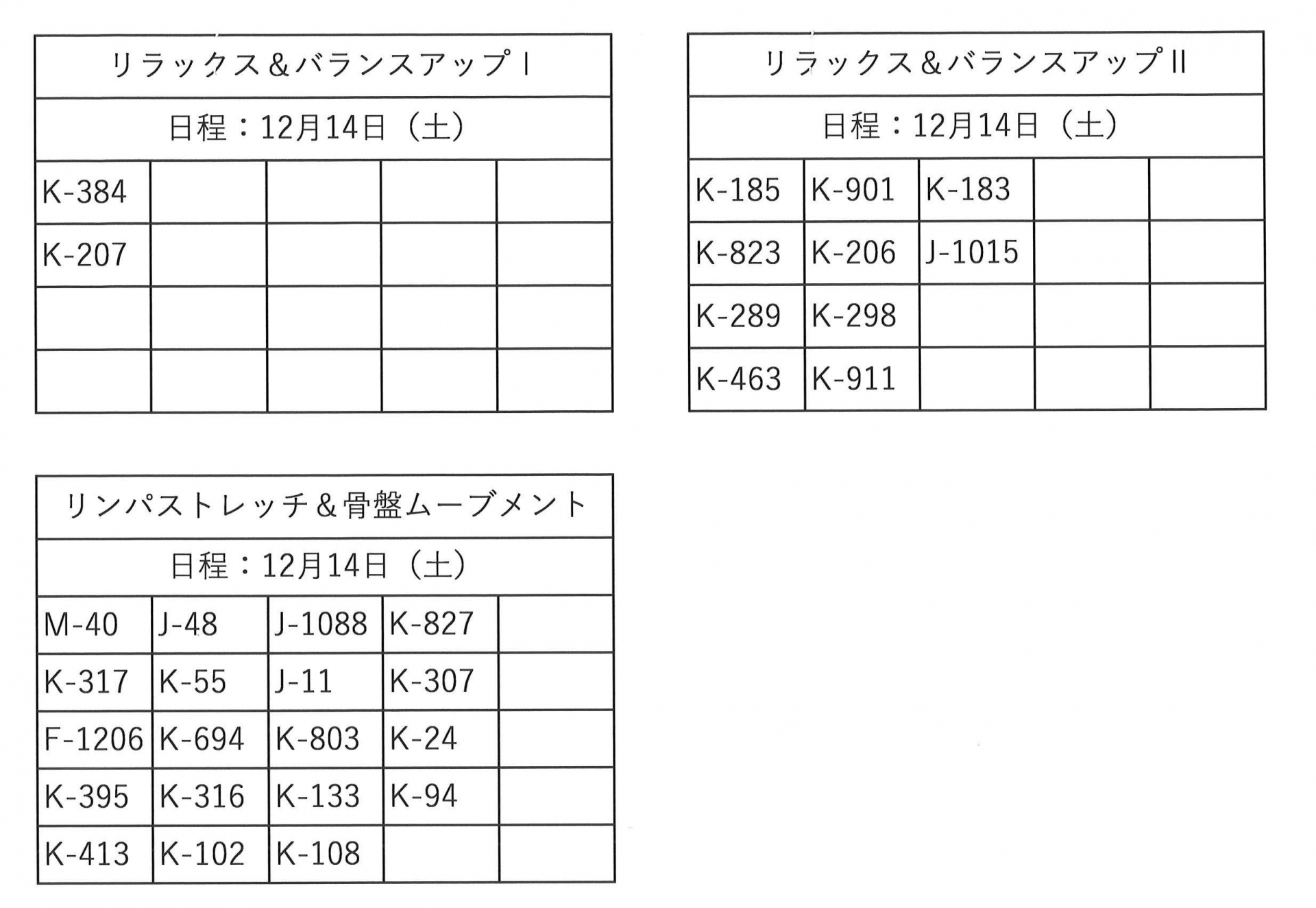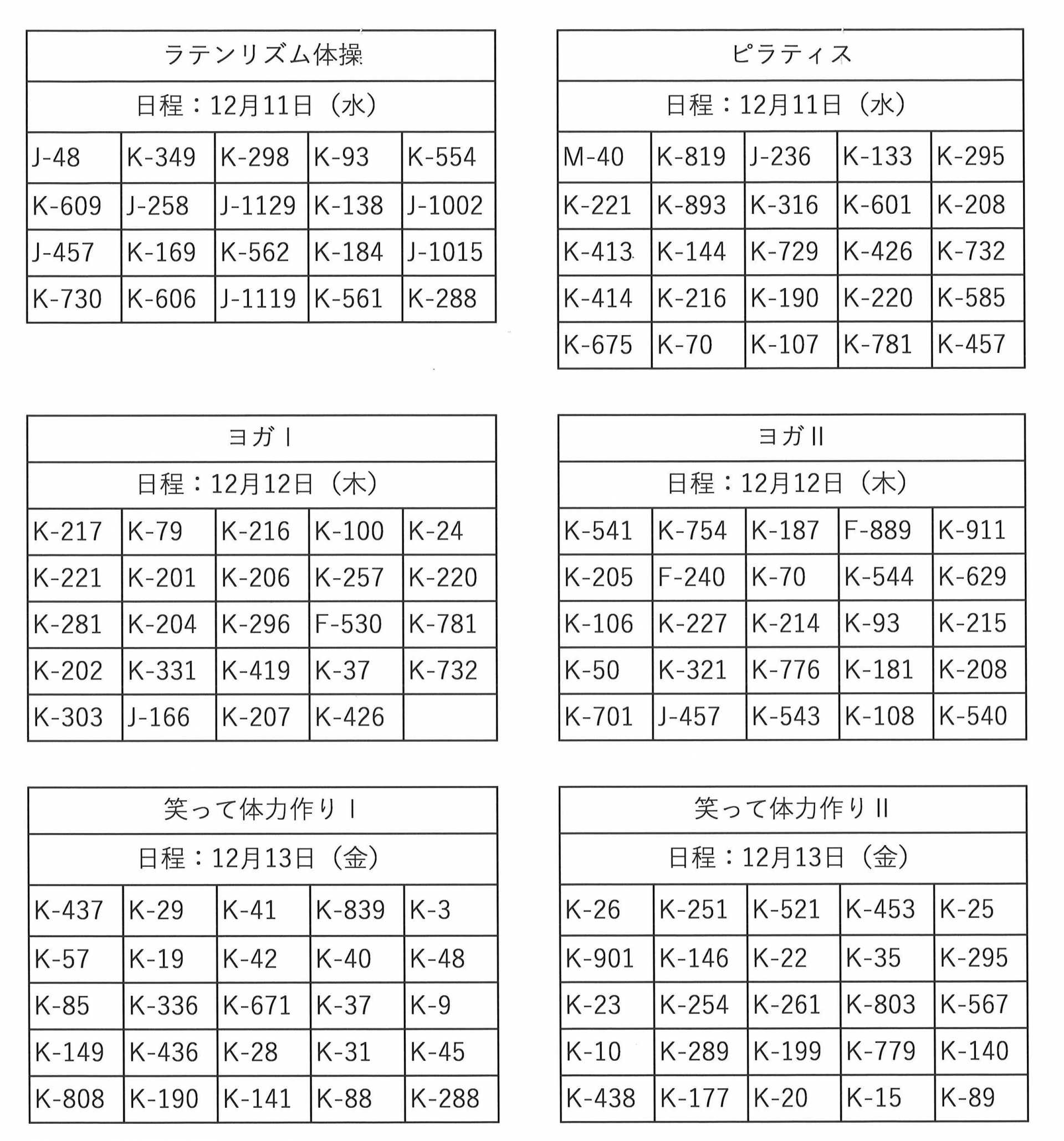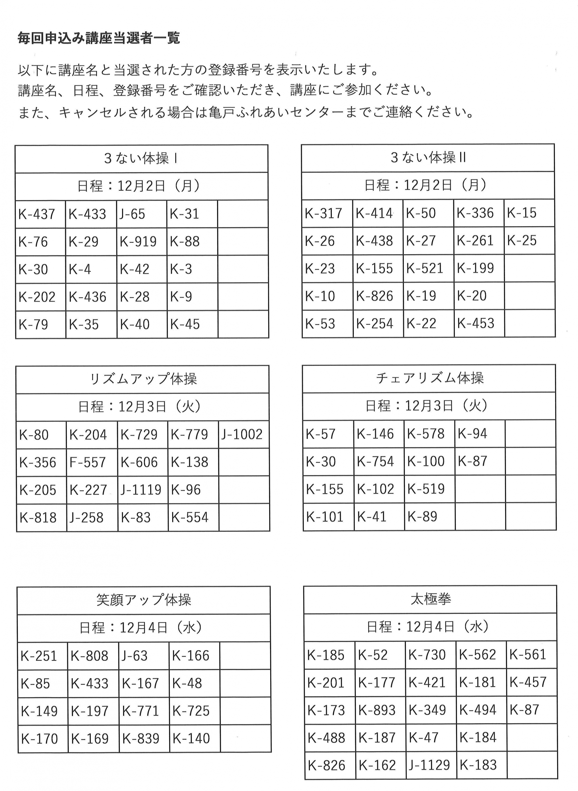 12月前半開催毎回申込講座 当選連絡その1【体操講座】