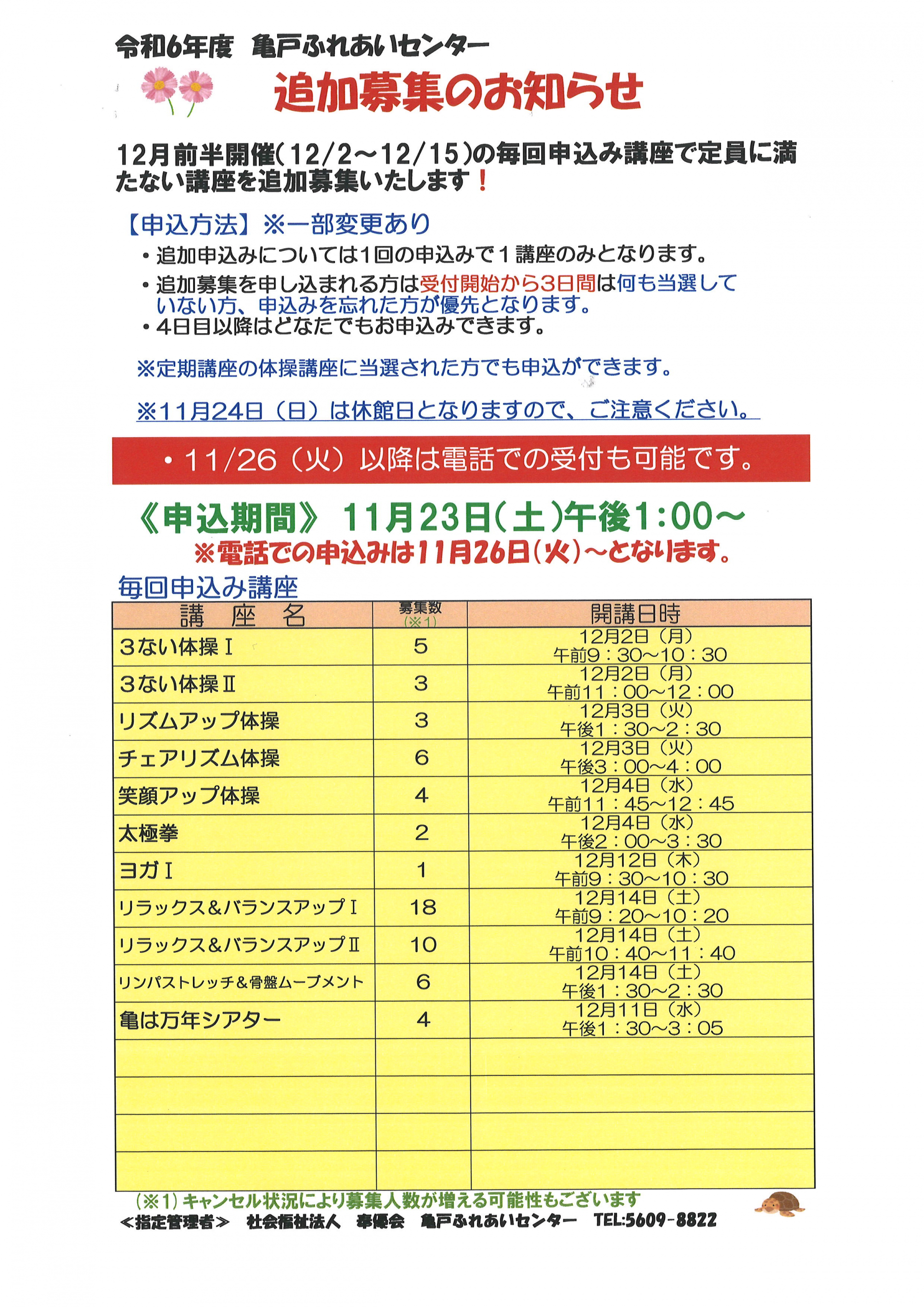 12月前半開催の毎回申込講座で定員に満たなかった講座の追加募集を行います。追加募集する講座は以下の講座になります。