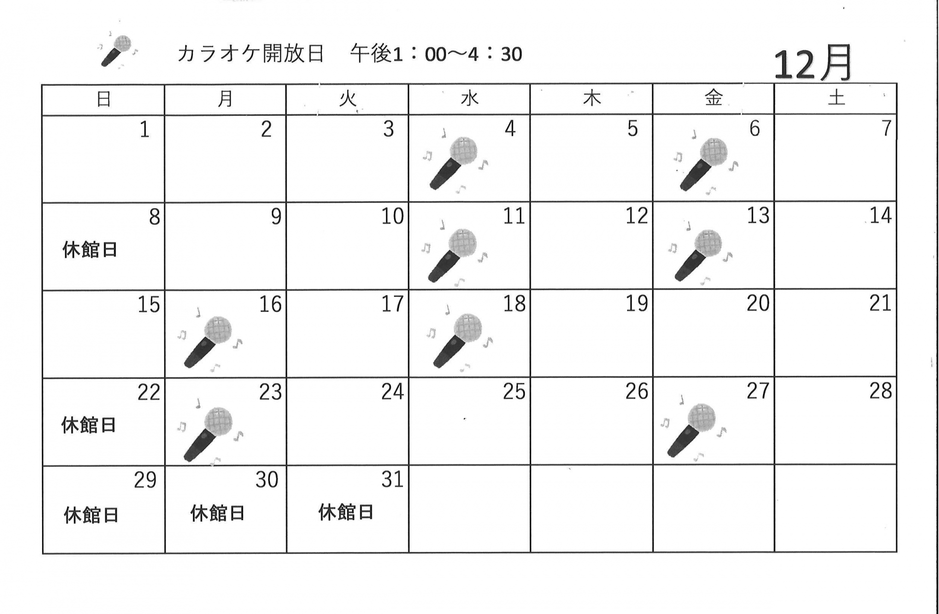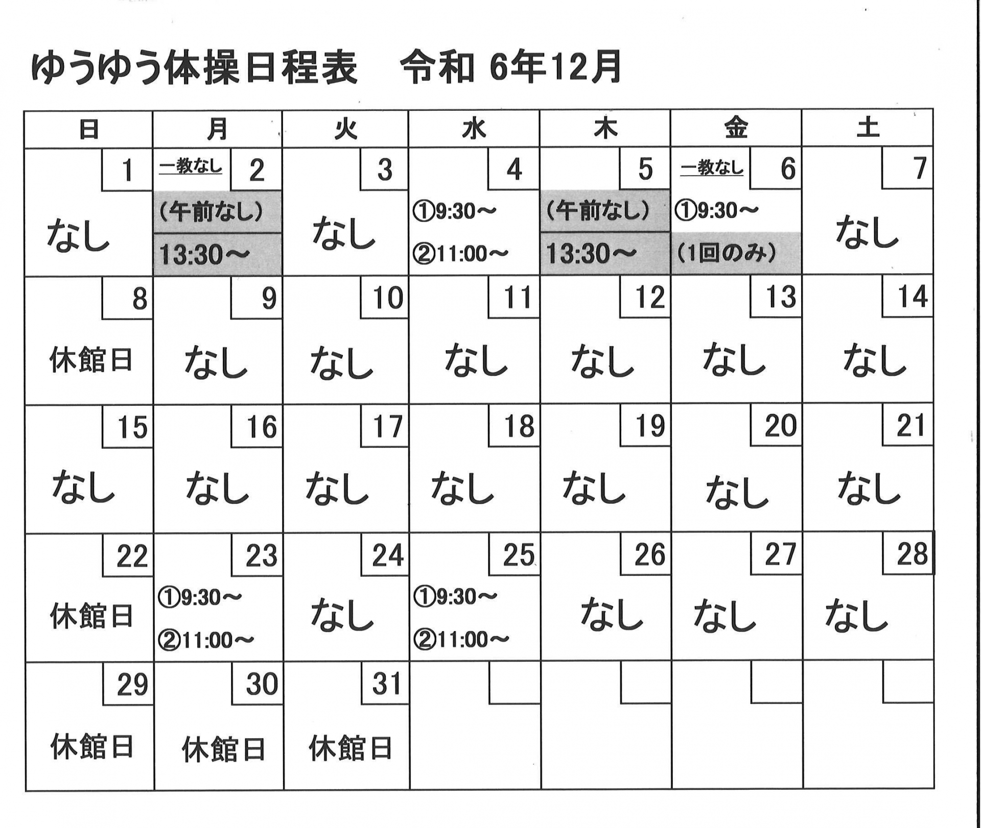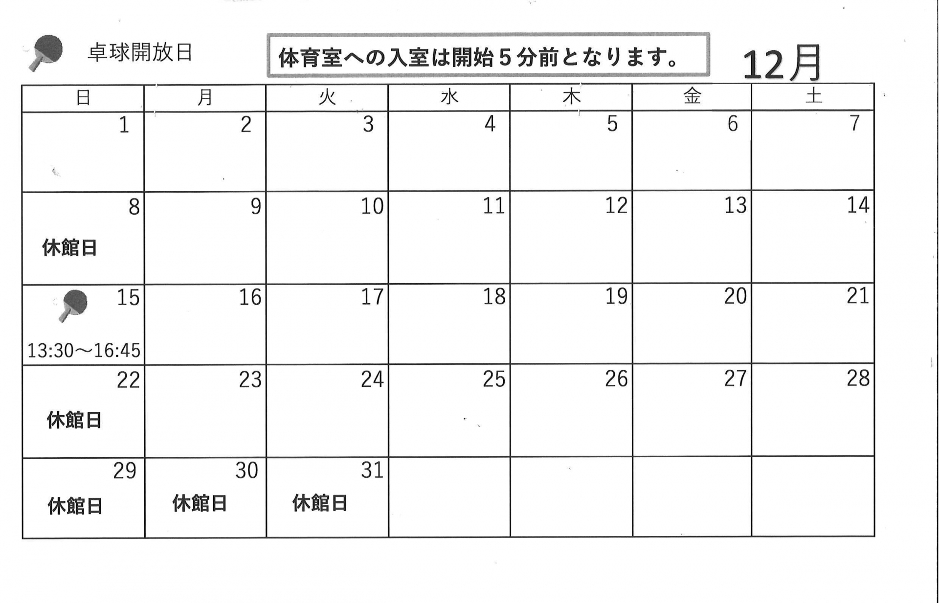 12月開催【ゆうゆう体操、カラオケ自由開放、卓球自由開放】日程表のお知らせです。