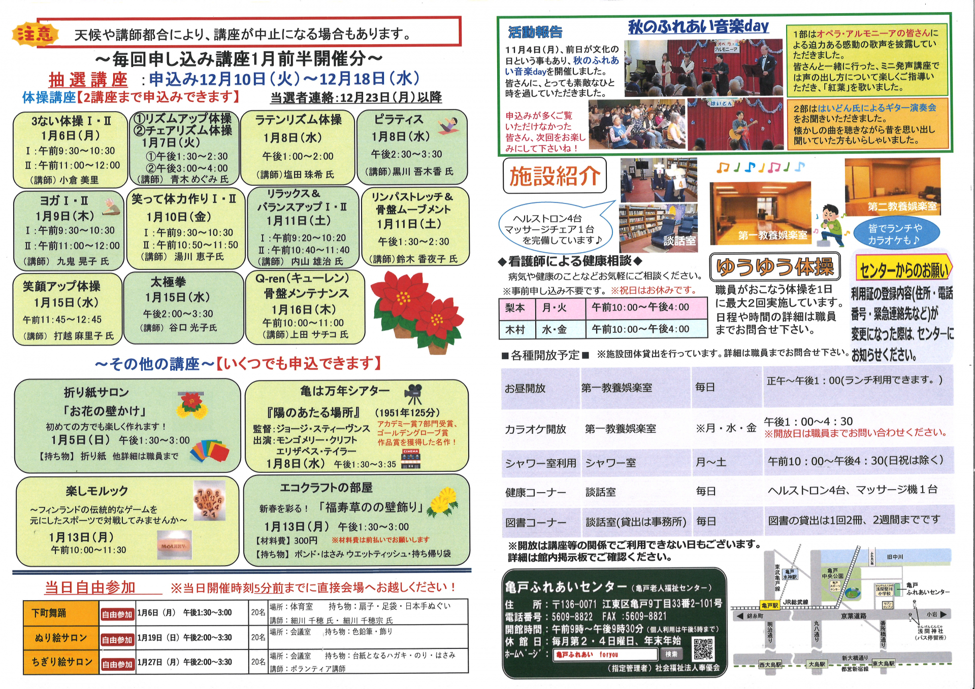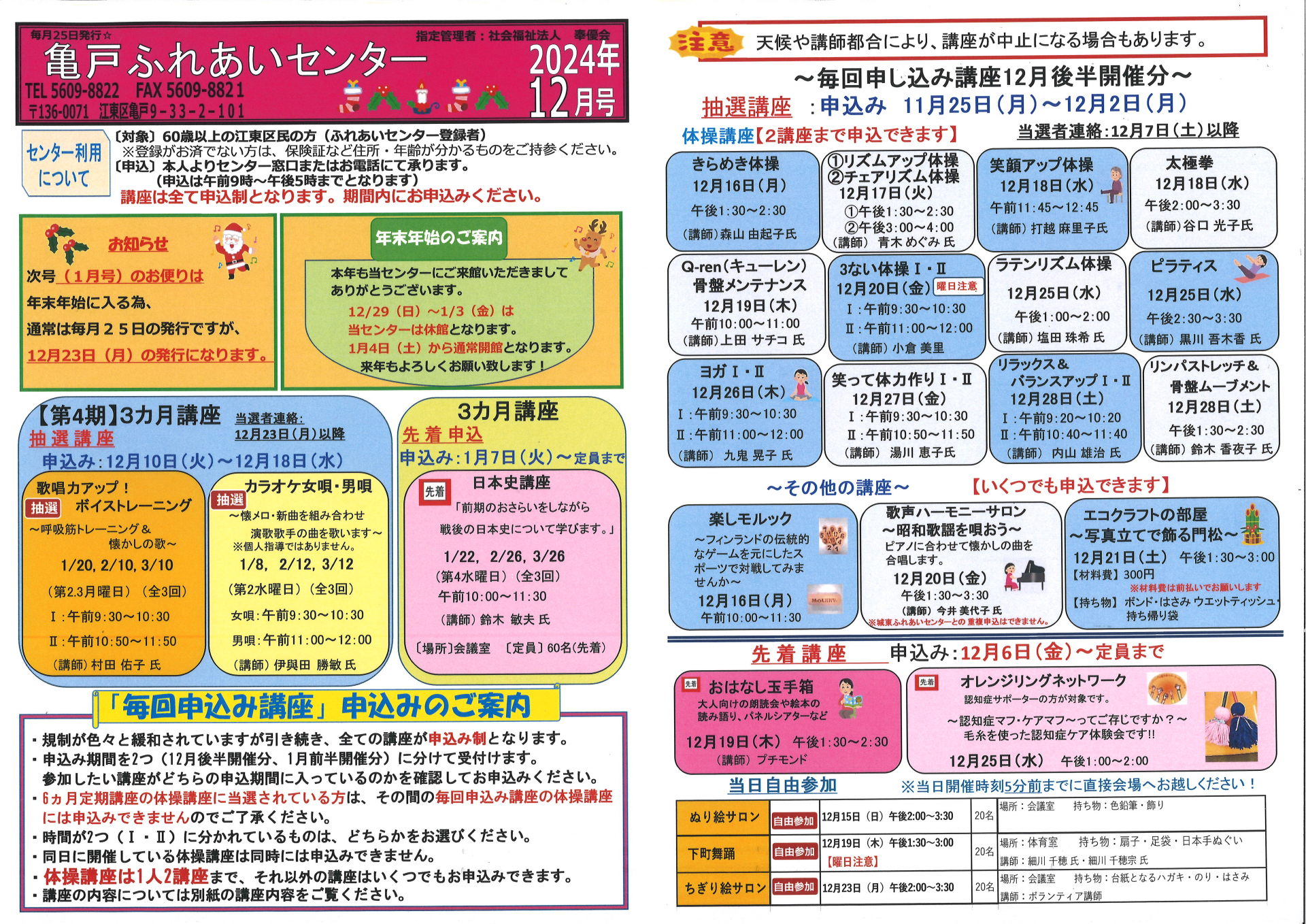 2024.11.25 お知らせ 2024年亀戸ふれあいセンター12月号おたより Tweet シェアする 2024年亀戸ふれあいセンター12月号おたより完成しました。 前の記事 2024.11.25 お知らせ 2024亀戸ふれあいセンター12月号予定表 次の記事 2024.11.22 お知らせ 12月前半開催毎回申込講座 追加募集のご案内 一覧へ戻る