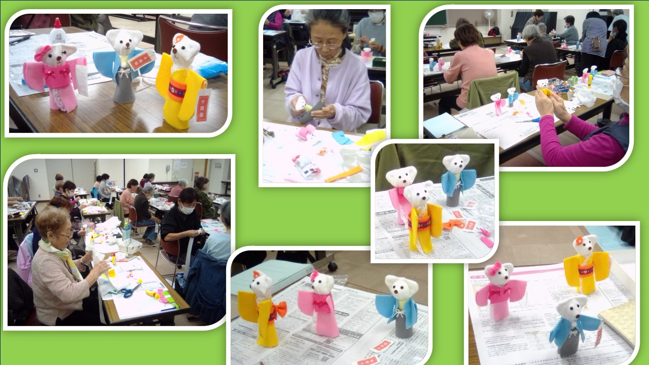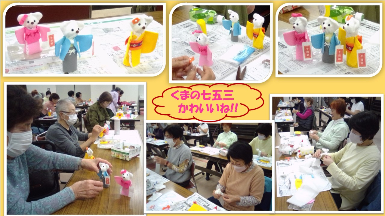 黄色の着物の7歳のくまさん、ブルーの羽織の5歳のくまさん、ピンクの被布の3歳のくまさん達が千歳飴を持って勢ぞろいしました。くまさんたちの着付けの前にペーパーをくるくる巻き付けて体の肉付けをしました、巻き方が緩すぎたり細すぎたりと悪戦苦闘していましたが、可愛いくまの七五三が完成しました!!