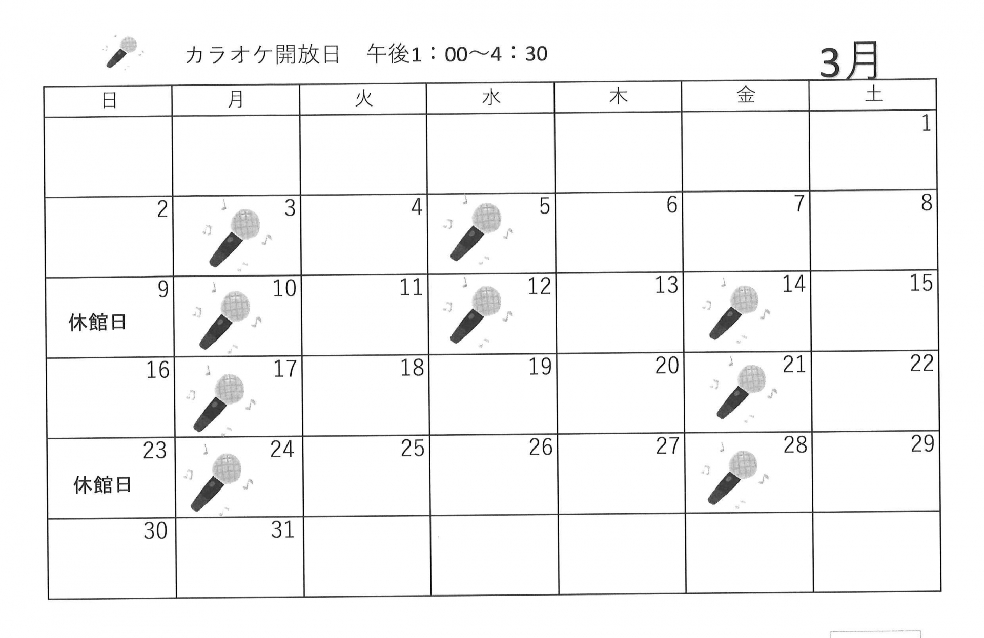 3月自由参加【ゆうゆう体操、カラオケ自由開放、卓球自由開放】日程表
