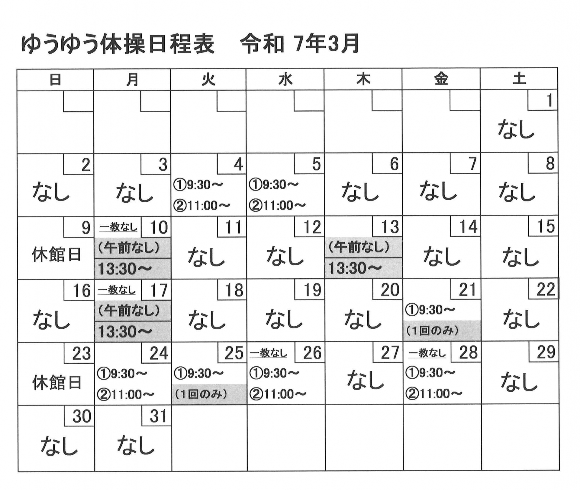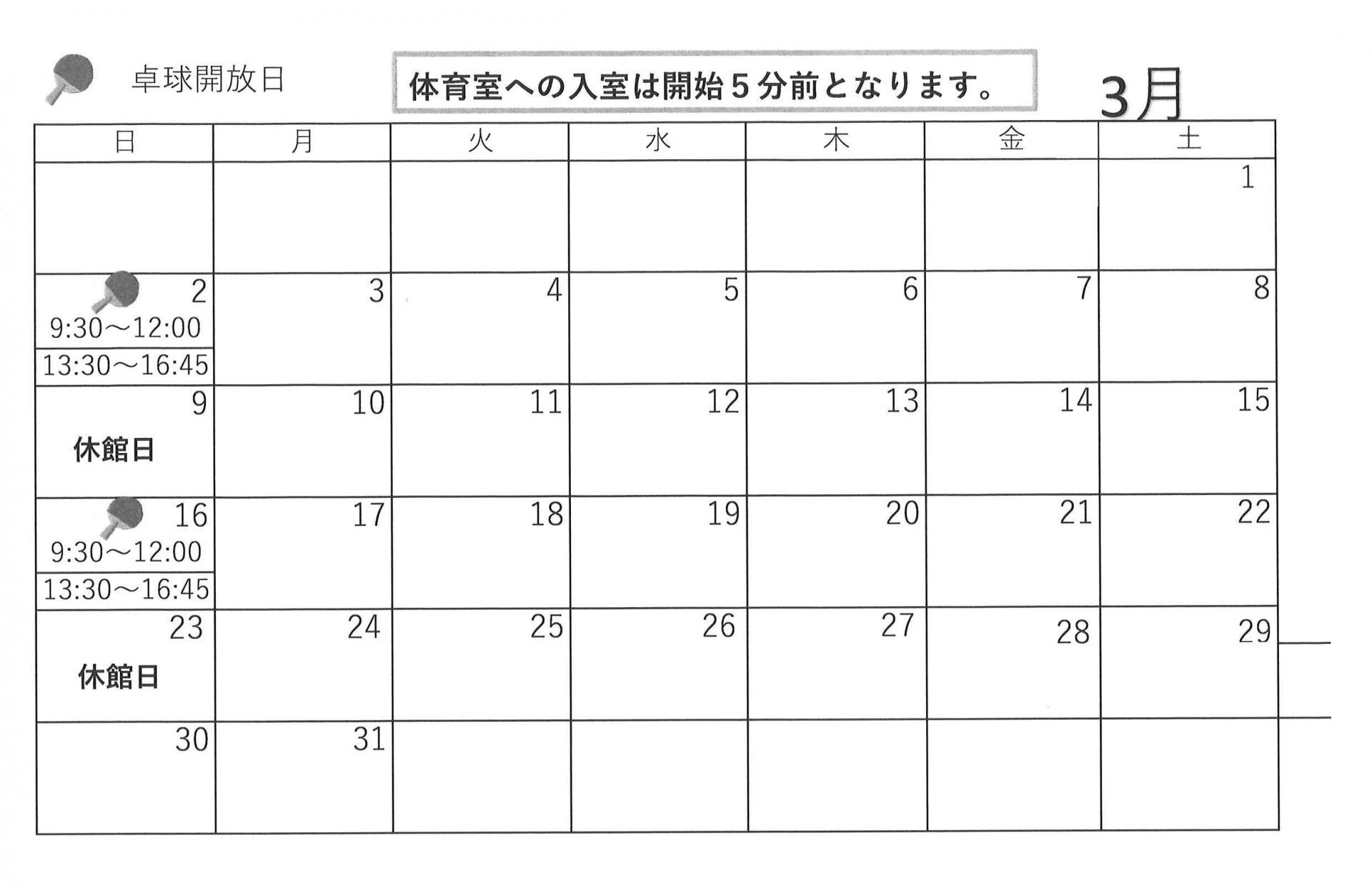 3月開催【ゆうゆう体操、カラオケ自由開放、卓球自由開放】日程表のお知らせです。