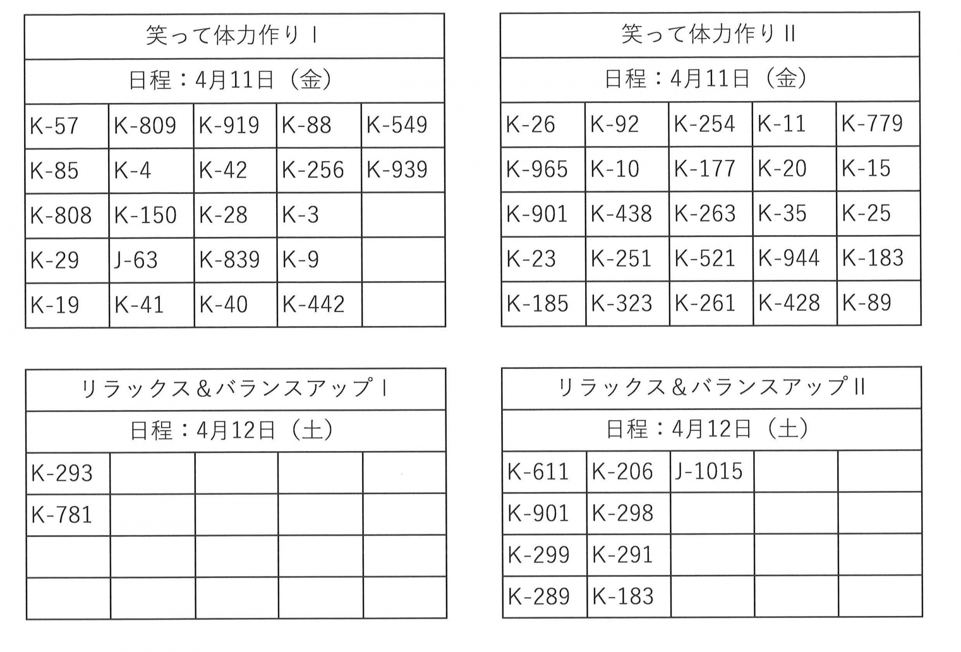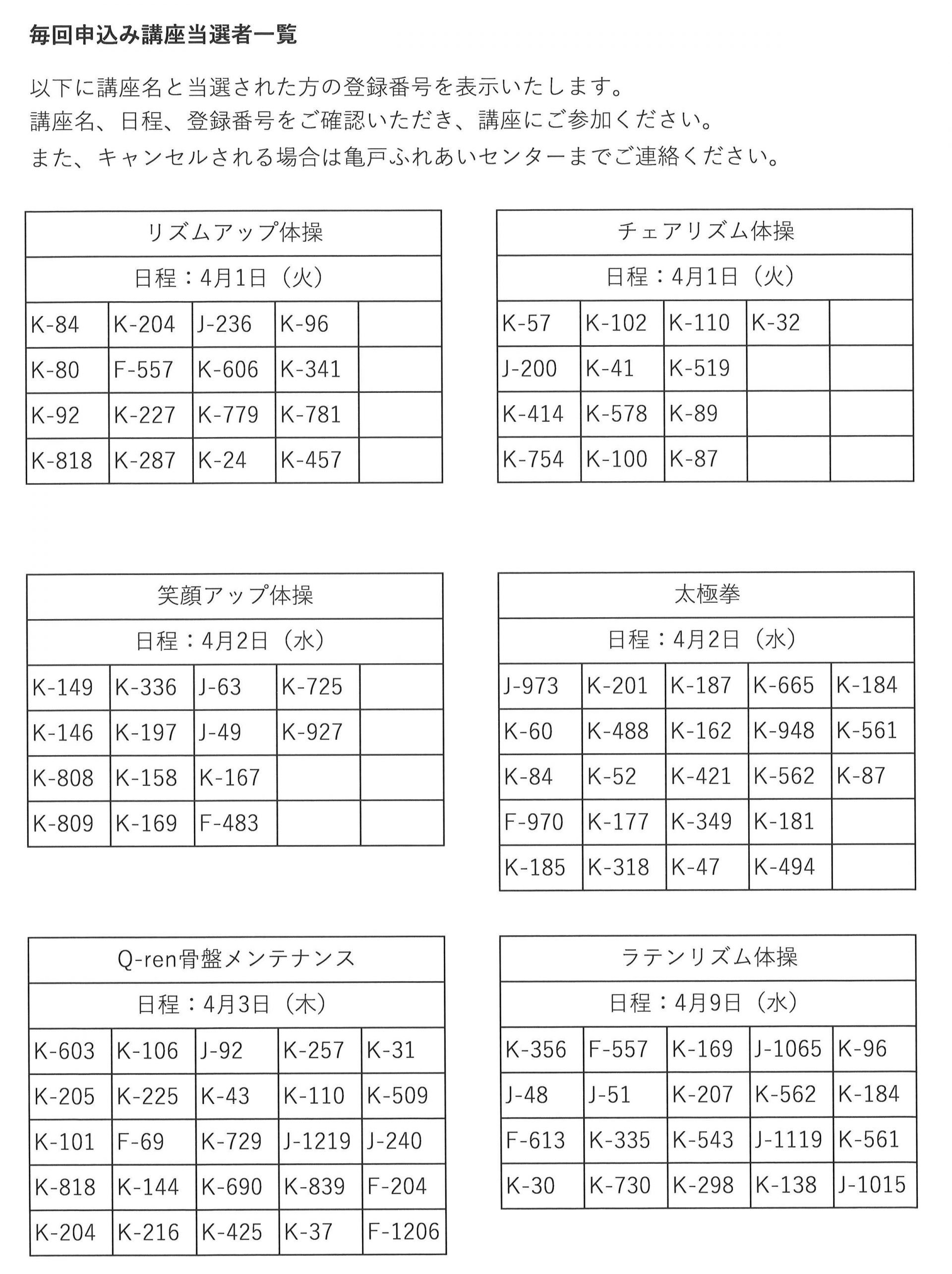 4月前半開催の毎回申込み講座の当選発表をいたします。