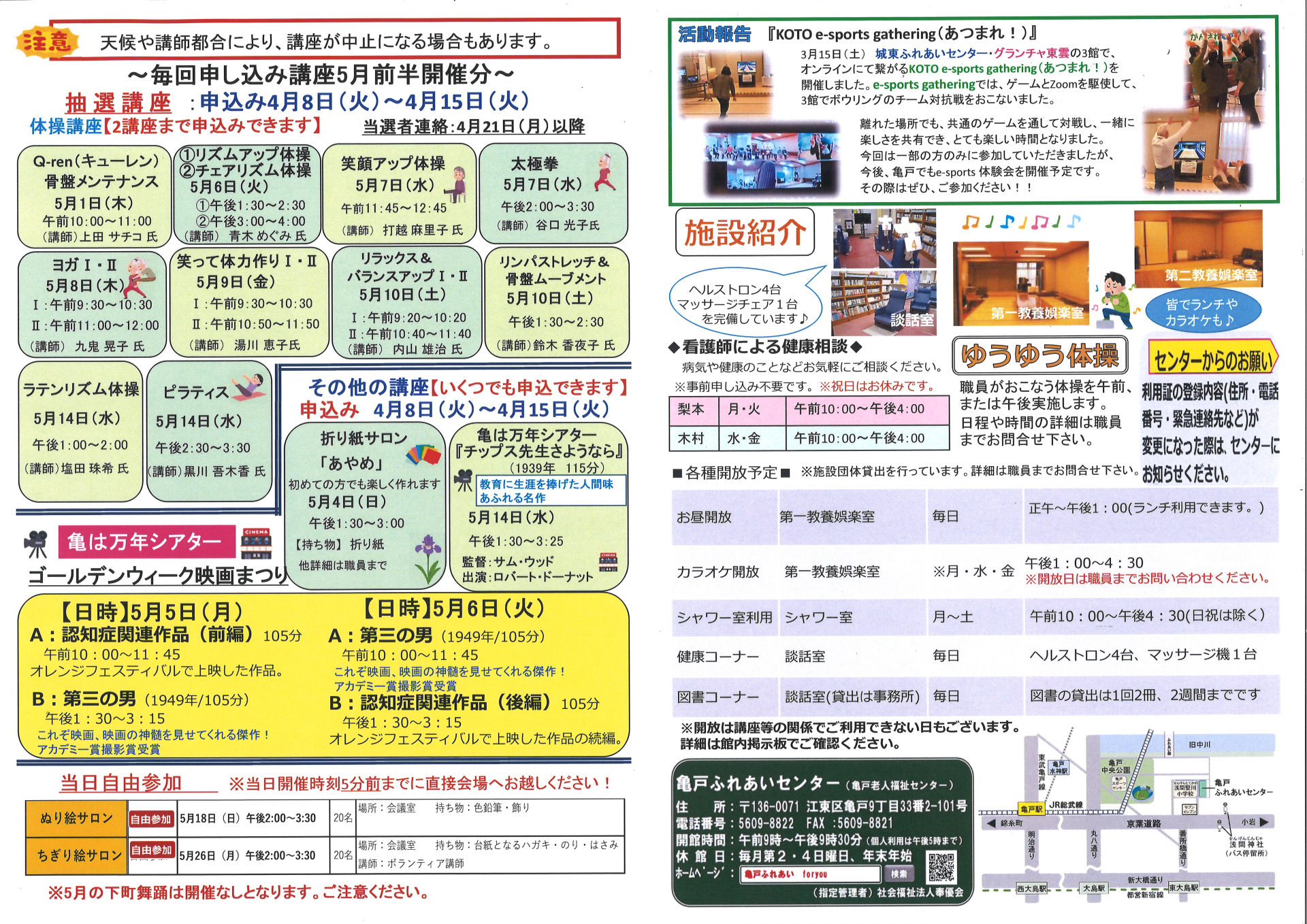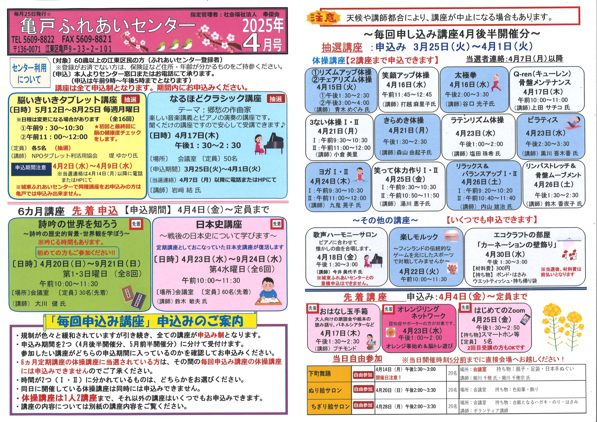 2025.03.25 お知らせ 2025年亀戸ふれあいセンター4月号おたより Tweet シェアする 2025年亀戸ふれあいセンター4月号おたより完成しました。 前の記事 2025.03.25 お知らせ 4月自由参加【ゆうゆう体操、カラオケ自由開放、卓球自由開放】 次の記事 2025.03.25 お知らせ 2025年亀戸ふれあいセンター4月号予定表 一覧へ戻る