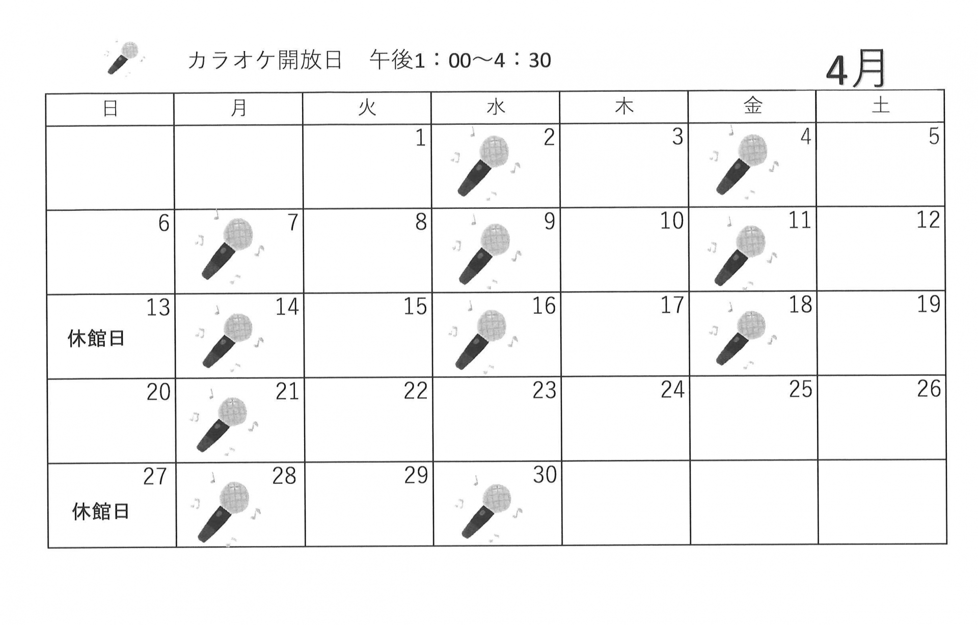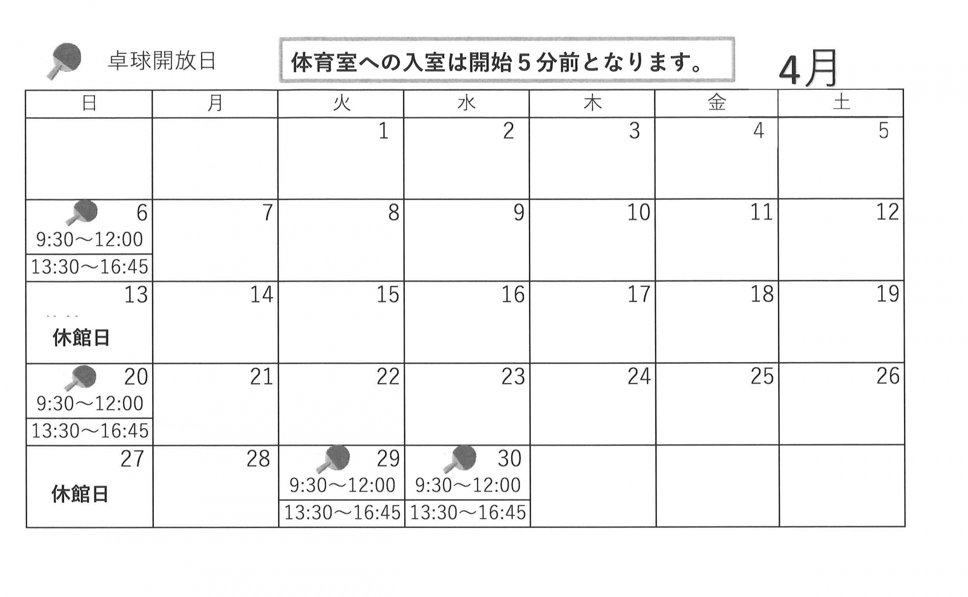 4月開催【ゆうゆう体操、カラオケ自由開放、卓球自由開放】日程表のお知らせです。