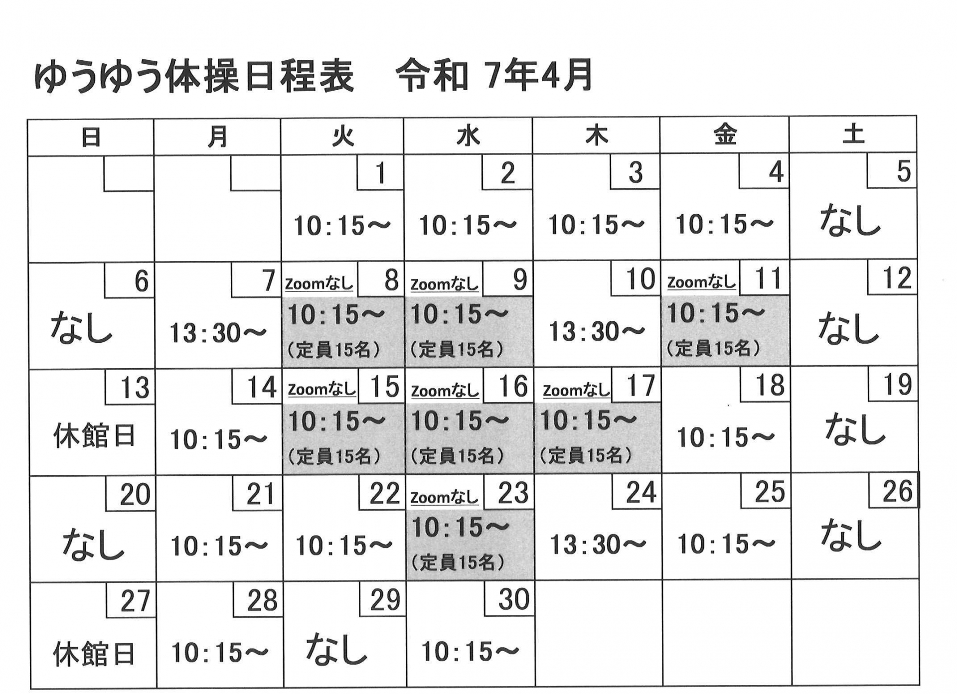 ①4月~のゆうゆう体操は、(土日祝日除く)平日は毎日開催となります。