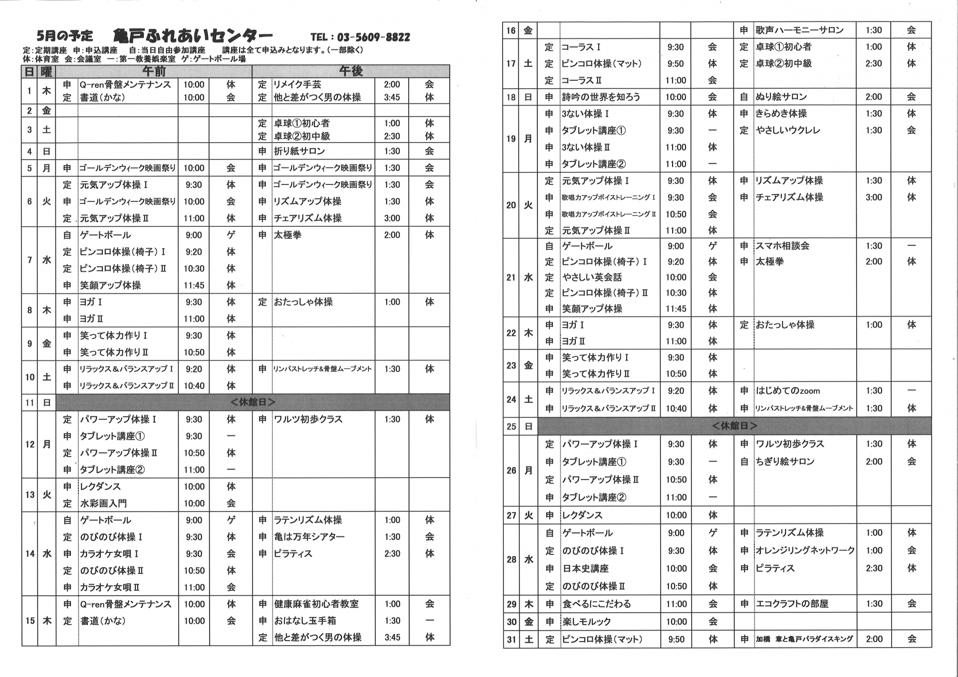 2025.04.25 お知らせ 2025年亀戸ふれあいセンター5月号予定表 Tweet シェアする 2025年亀戸ふれあいセンター5月号予定表、完成しました。 亀戸ふれあいセンター H.A 前の記事 2025.04.25 お知らせ 2025年亀戸ふれあいセンター5月号おたより 次の記事 2025.04.21 お知らせ 5月前半開催毎回申込講座 追加募集のご案内 一覧へ戻る