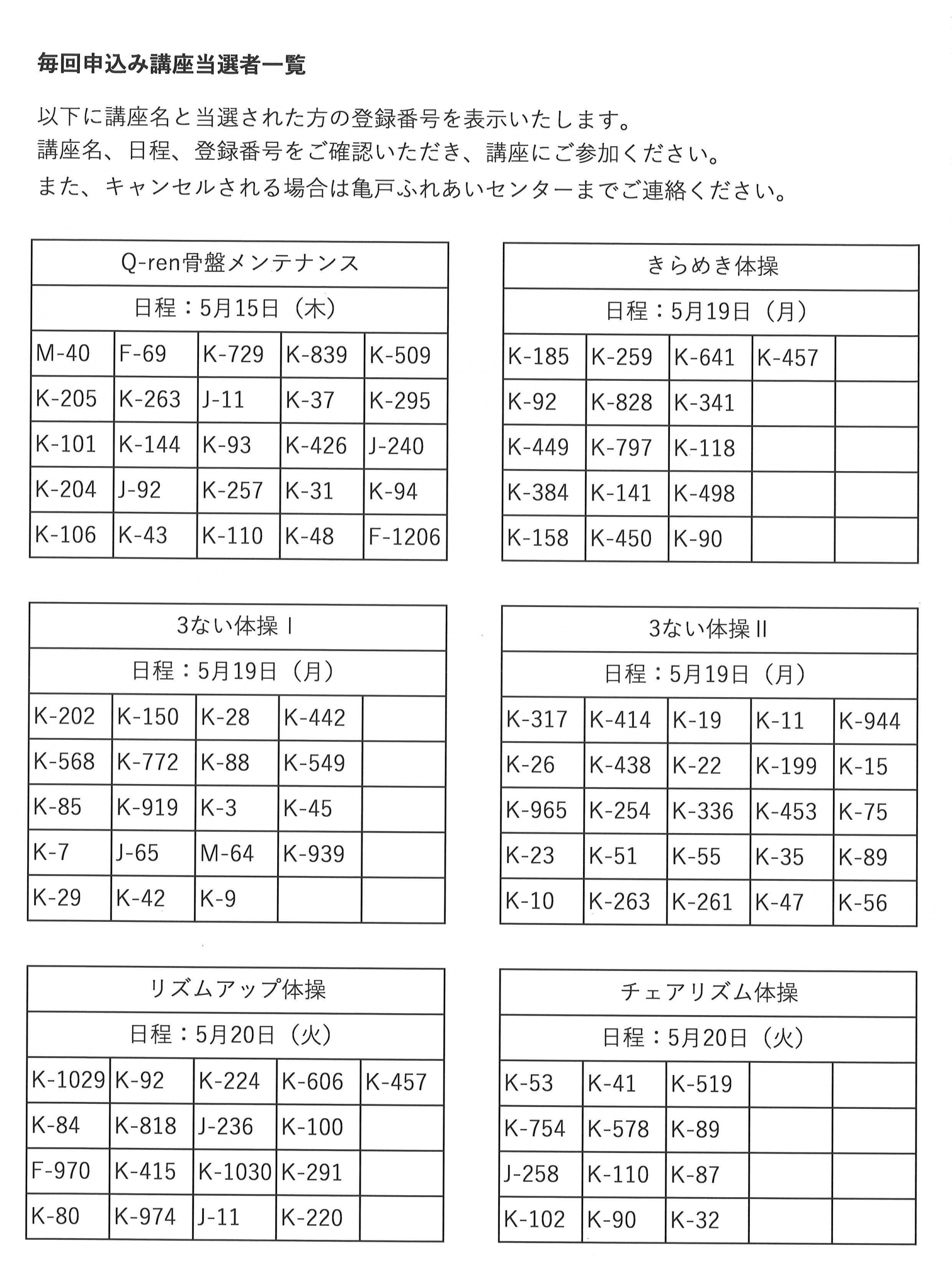 5月後半開催の毎回申込み講座の当選発表をいたします。