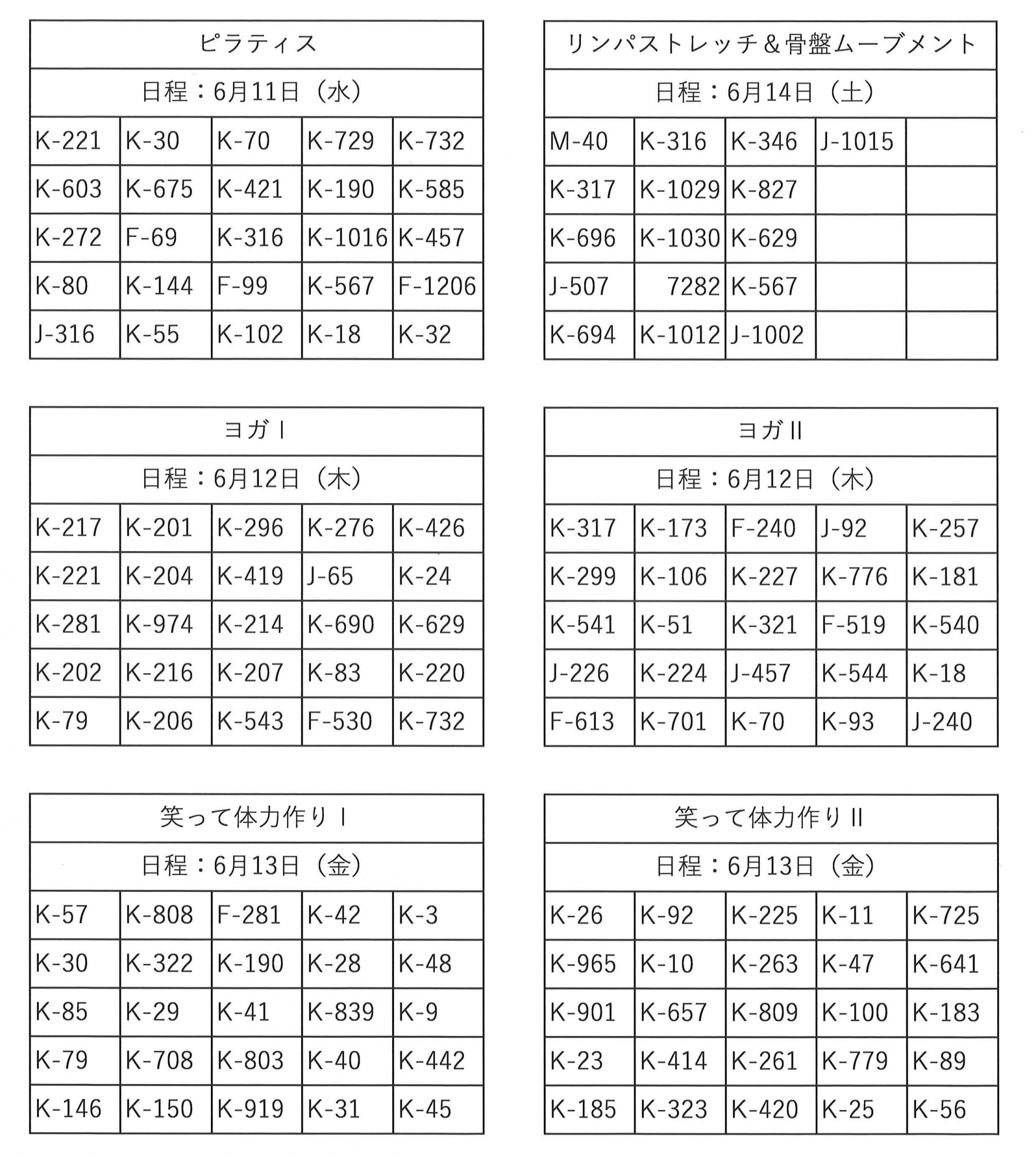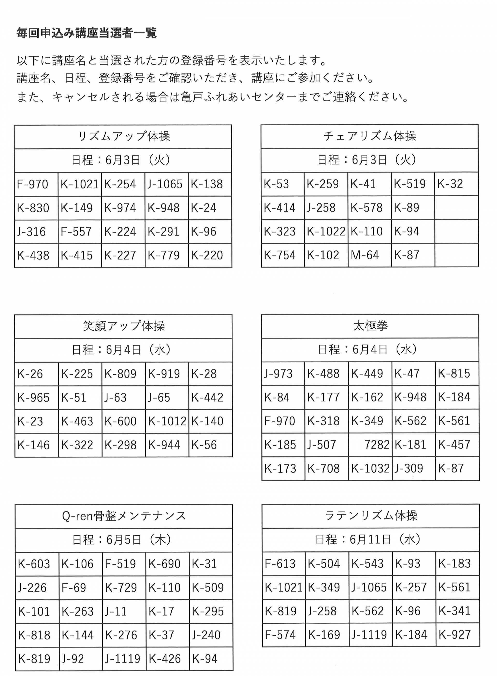 6月前半開催毎回申込講座 当選連絡その1【体操講座】