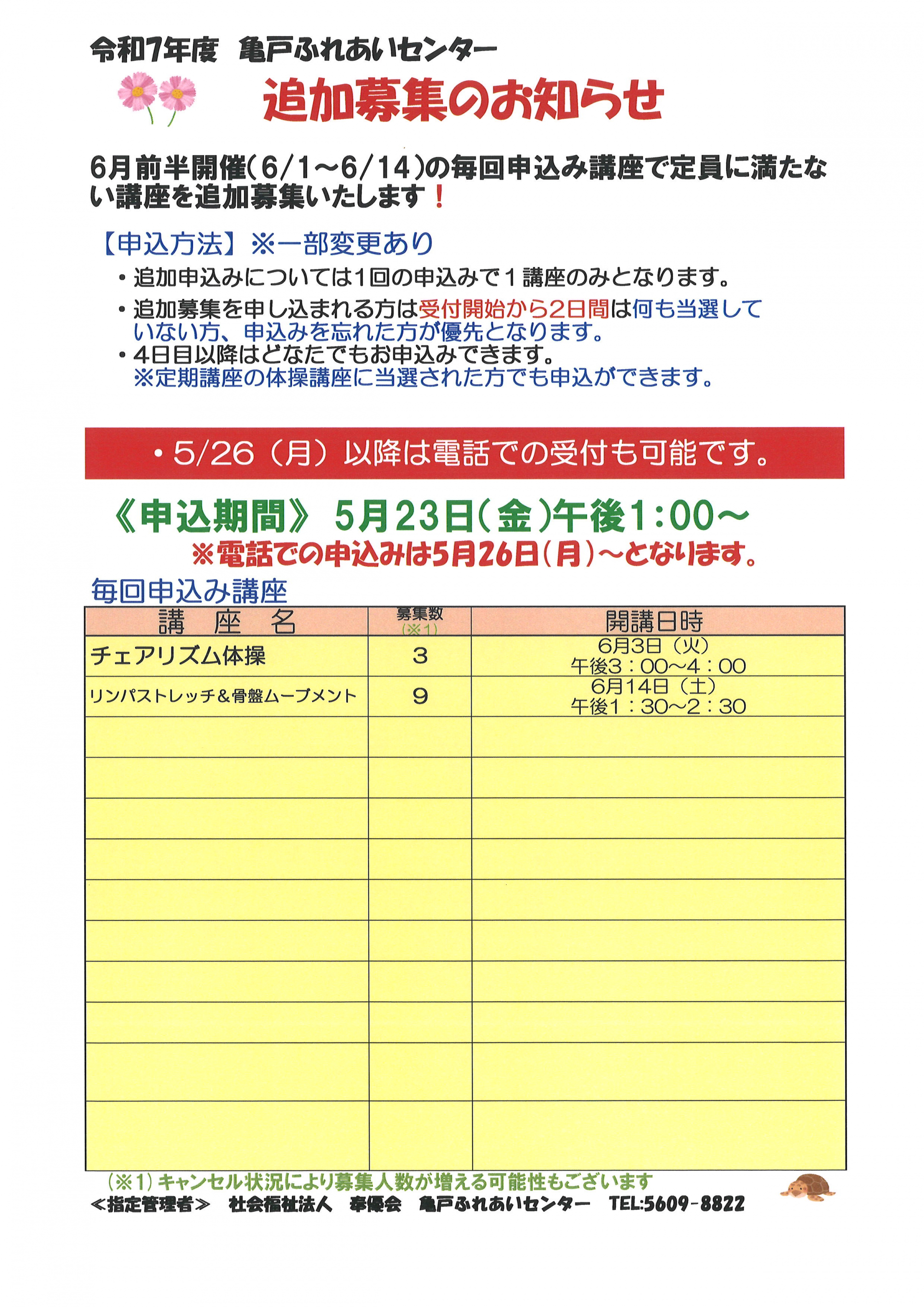 6月前半開催の毎回申込講座で定員に満たなかった講座の追加募集を行います。追加募集する講座は以下の講座となります。