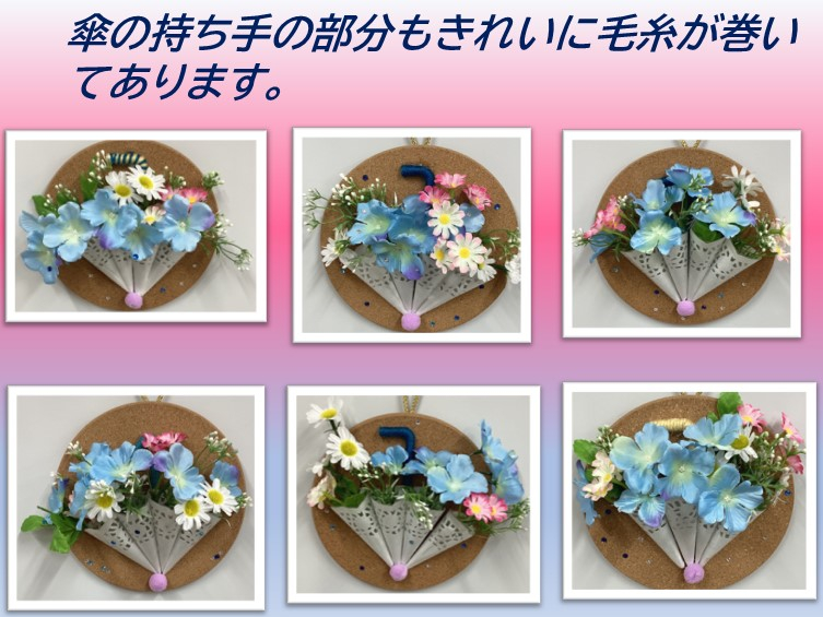 ここに季節のお花を飾ったり、雨のしずくの様にビーズを飾ったりすると、素敵な『レースペーパーで作る傘』の出来上がり。