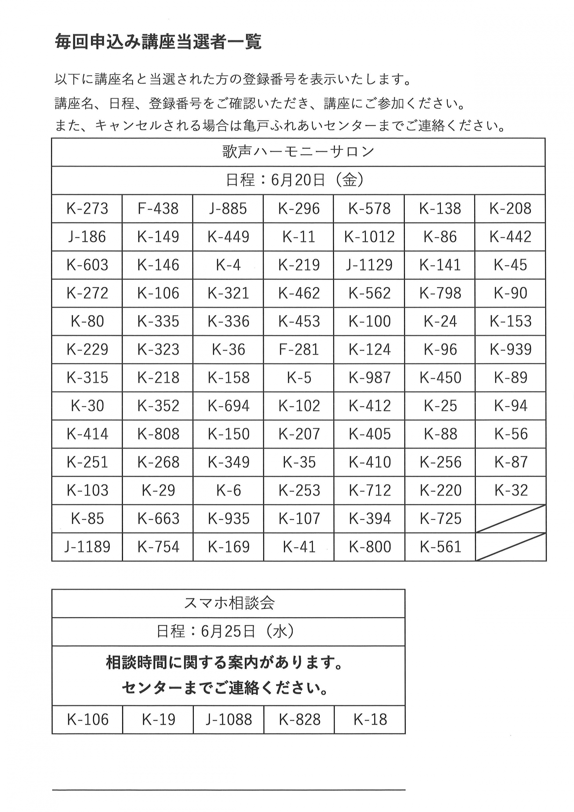 6月後半開催の毎回申込み講座の当選発表をいたします。