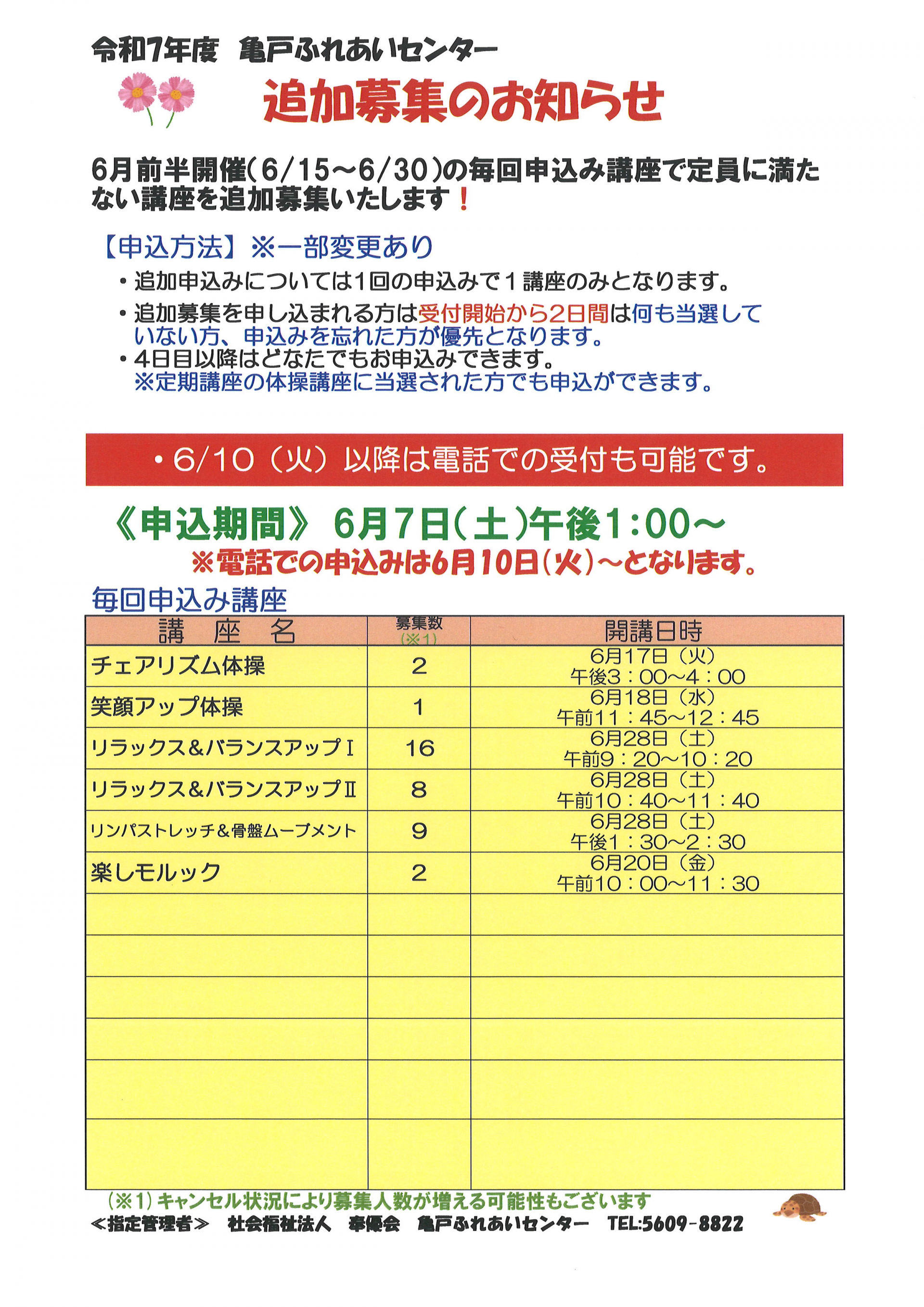 6月後半開催の毎回申込講座で定員に満たなかった講座の追加募集を行います。追加募集する講座は以下の講座となります。