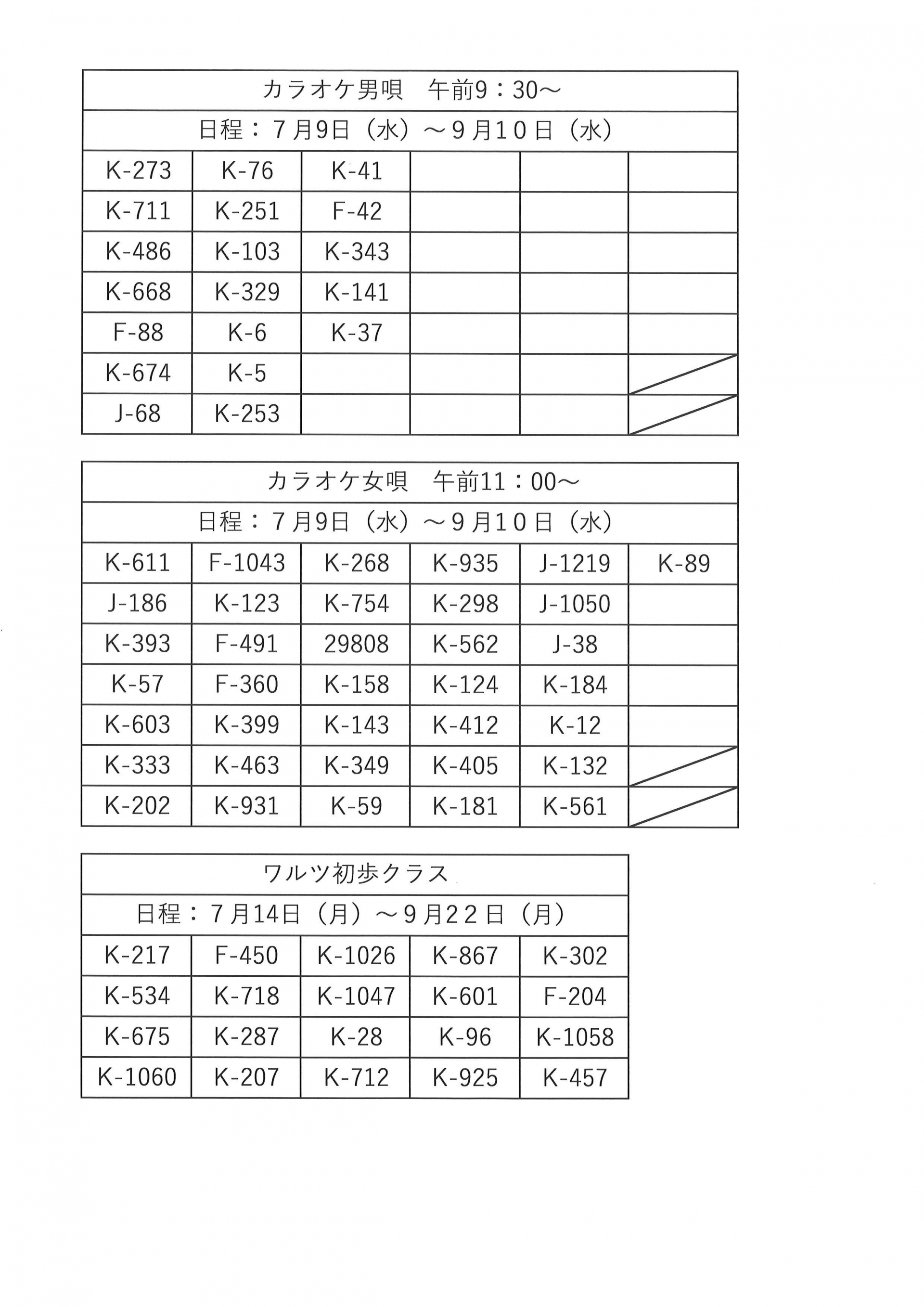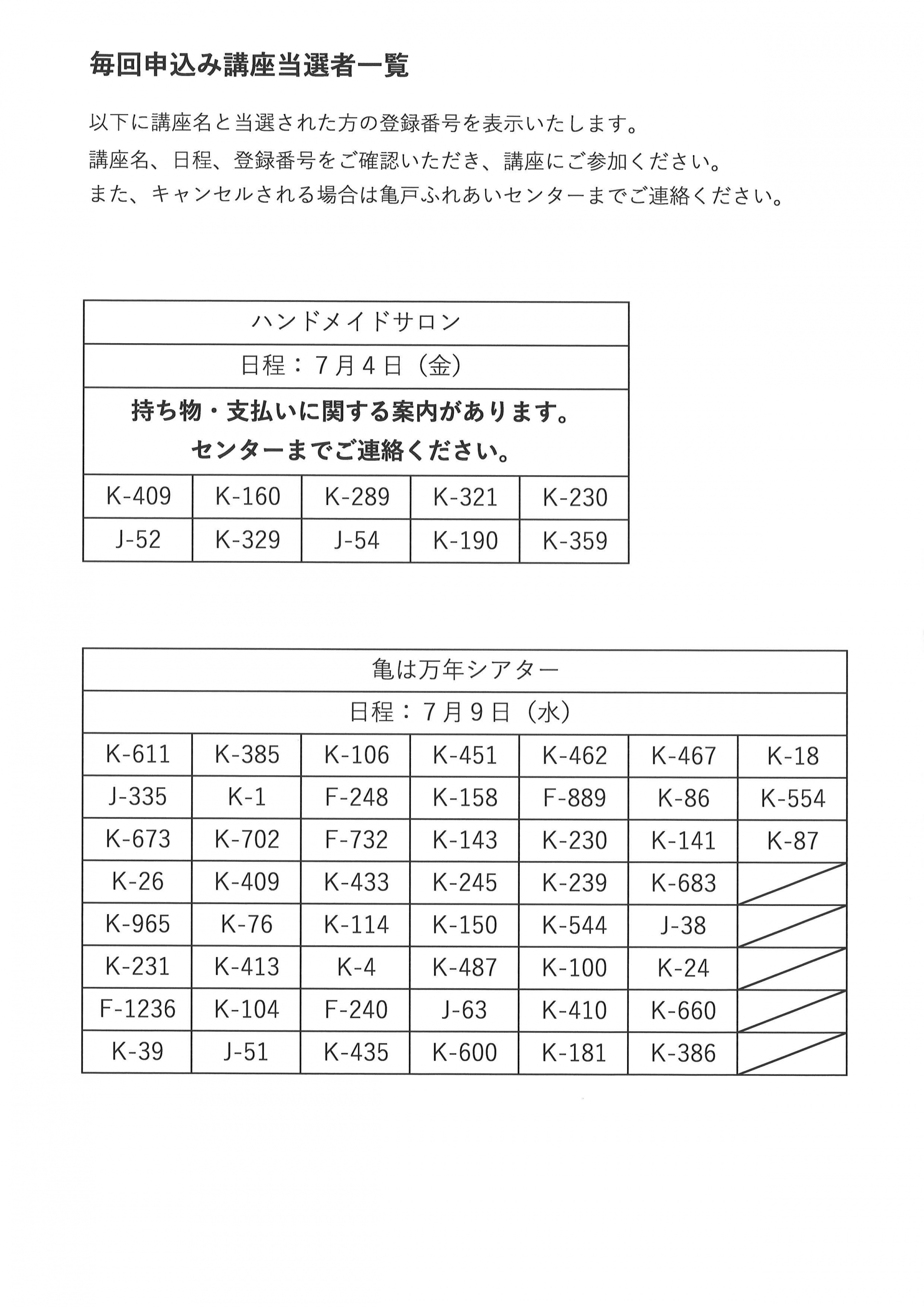 7月前半毎回申込講座 当選連絡その2【その他の講座】