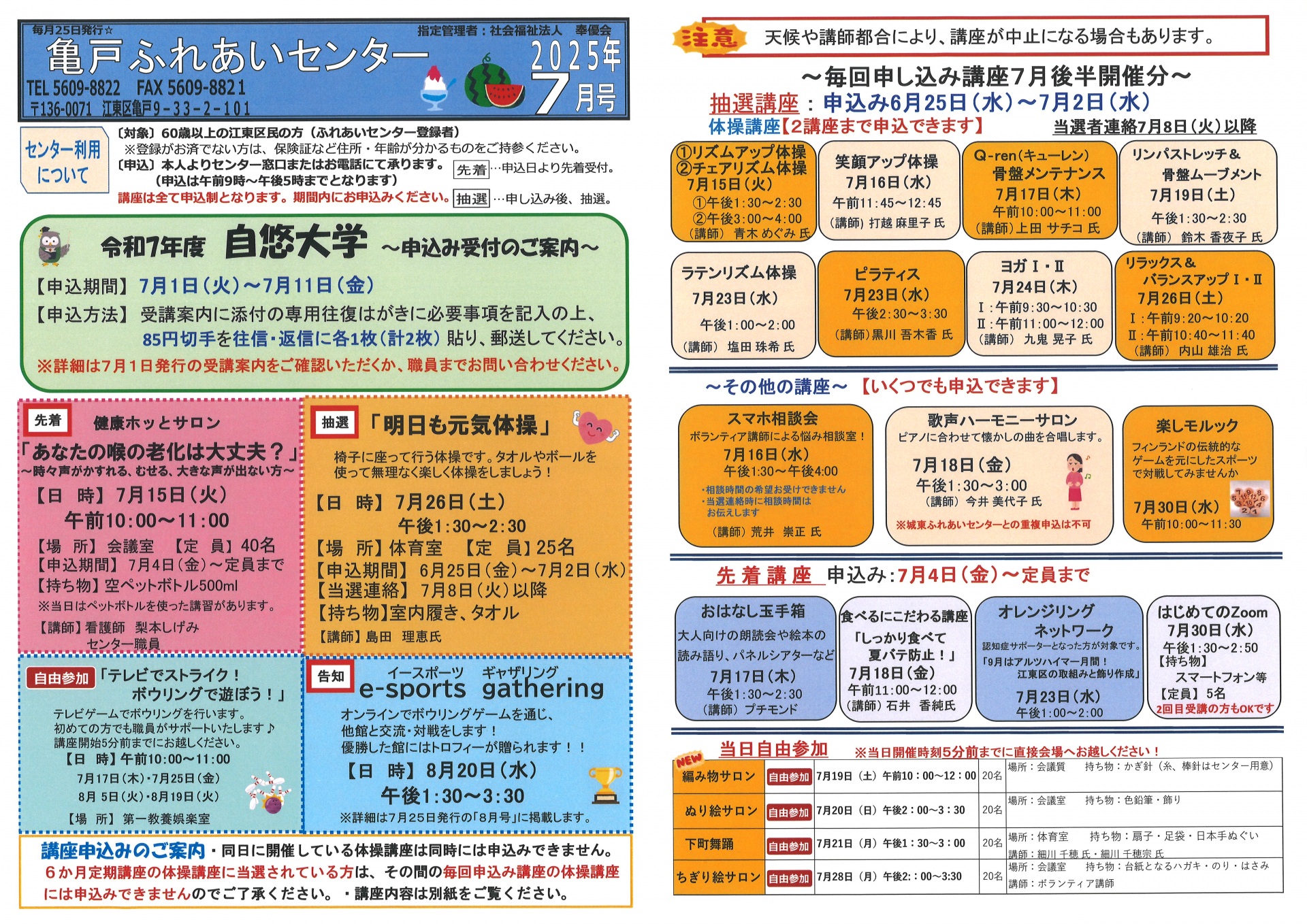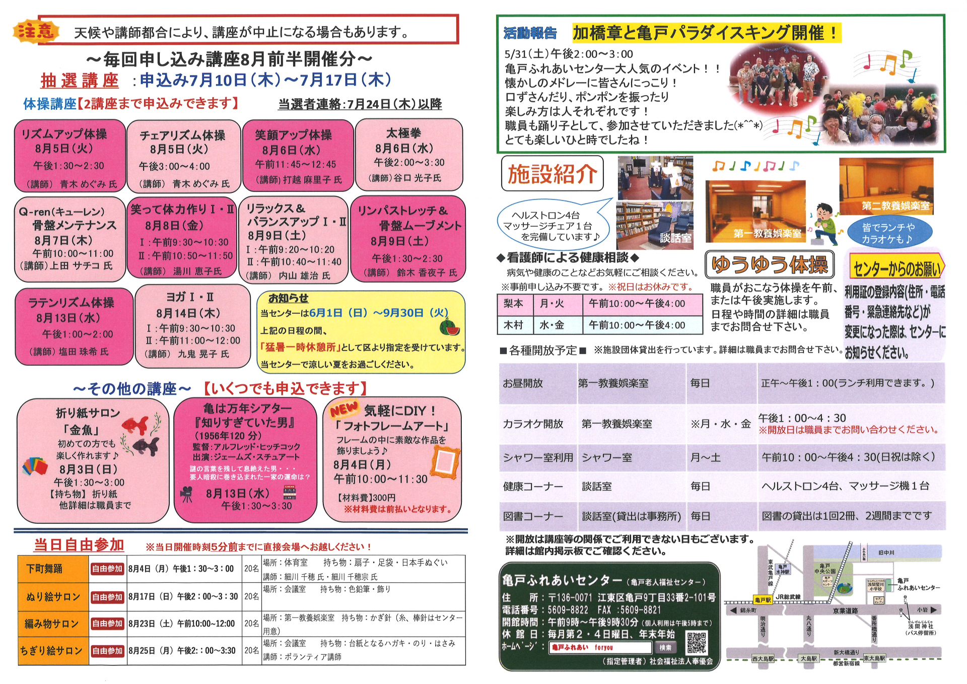 2025.06.25 お知らせ 2025年亀戸ふれあいセンター7月号おたより Tweet シェアする 2025年亀戸ふれあいセンター7月号おたより完成しました。 亀戸ふれあいセンター F.A 前の記事 2025.06.25 お知らせ 2025年亀戸ふれあいセンター7月号予定表 次の記事 2025.06.23 お知らせ 7月前半開催毎回申込講座 追加募集のご案内 一覧へ戻る