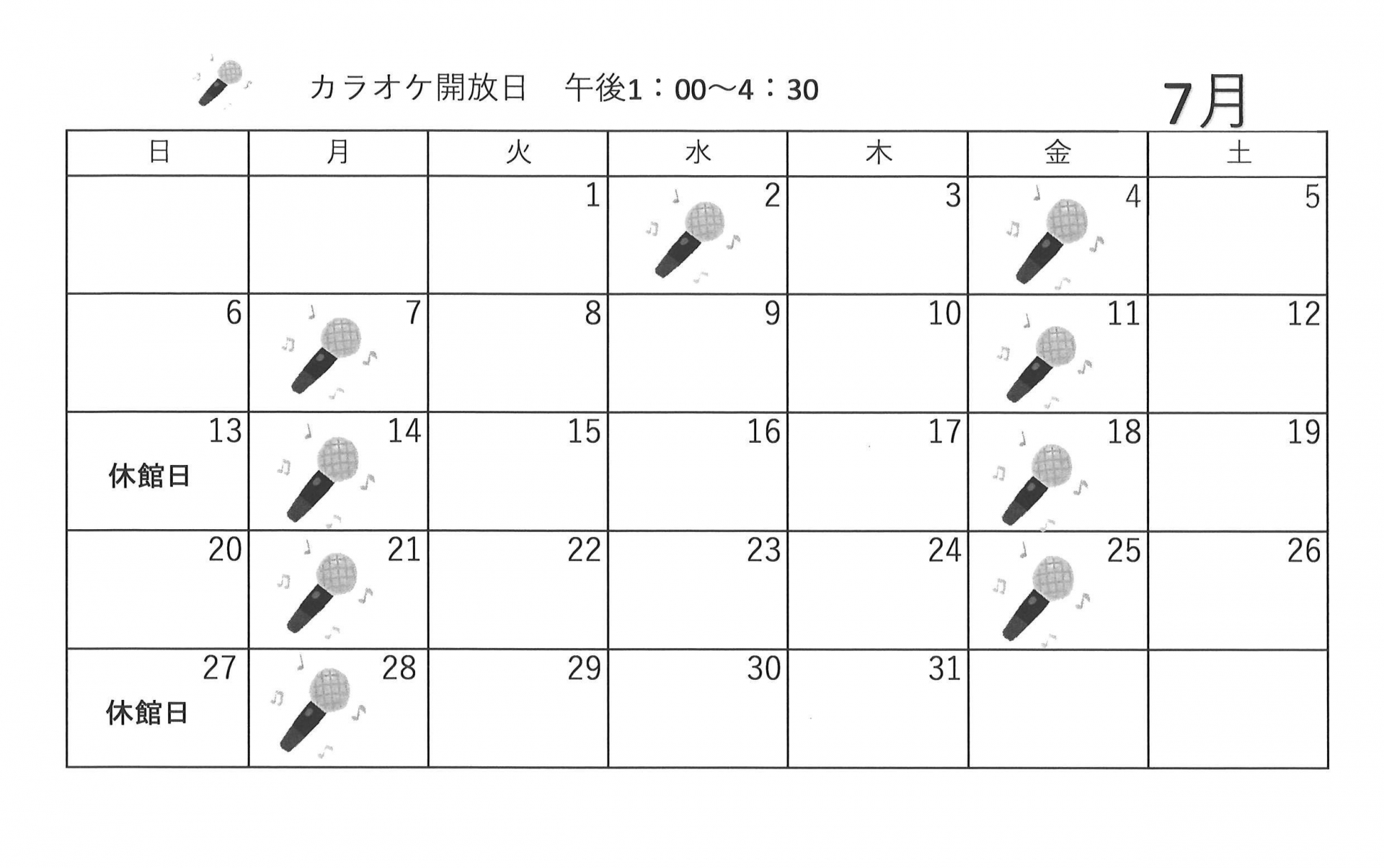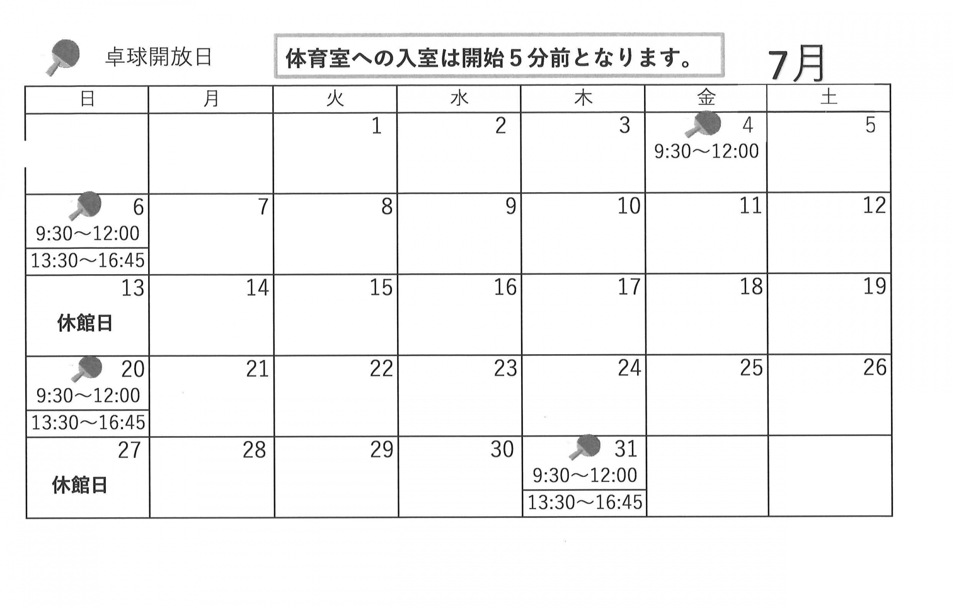 7月開催【ゆうゆう体操、カラオケ自由開放、卓球自由開放】日程表のお知らせです。
