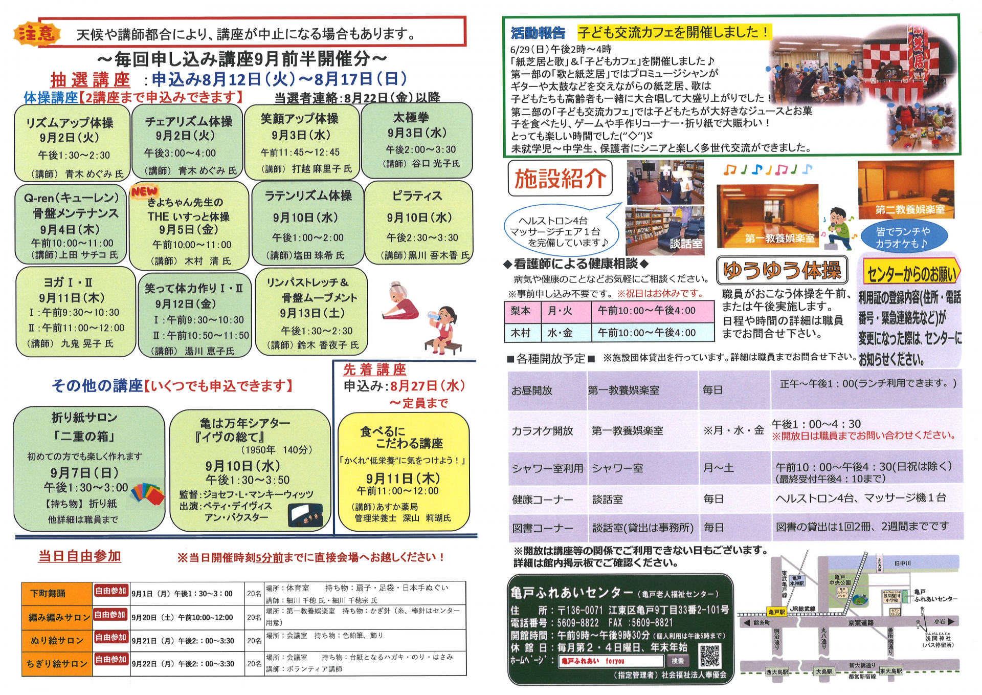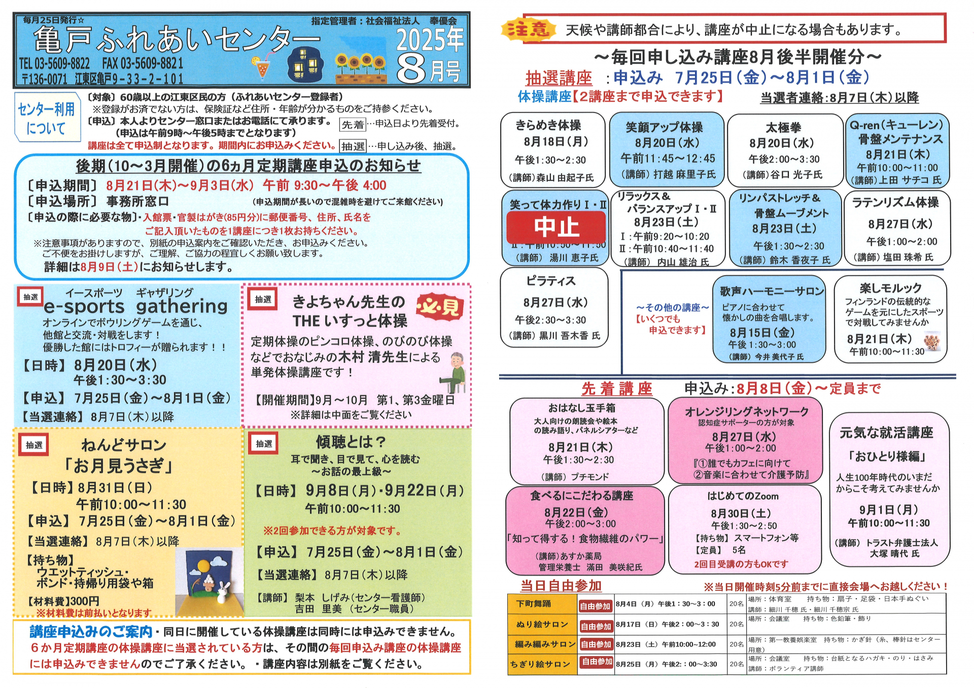 2025.07.25 お知らせ 2025年亀戸ふれあいセンター8月号おたより Tweet シェアする 2025年亀戸ふれあいセンター8月号おたより完成しました。 亀戸ふれあいセンター F.A 前の記事 2025.07.25 お知らせ 亀戸ふれあいセンター8月号予定表 次の記事 2025.07.24 お知らせ 8月前半開催毎回申込講座 追加募集のご案内 一覧へ戻る