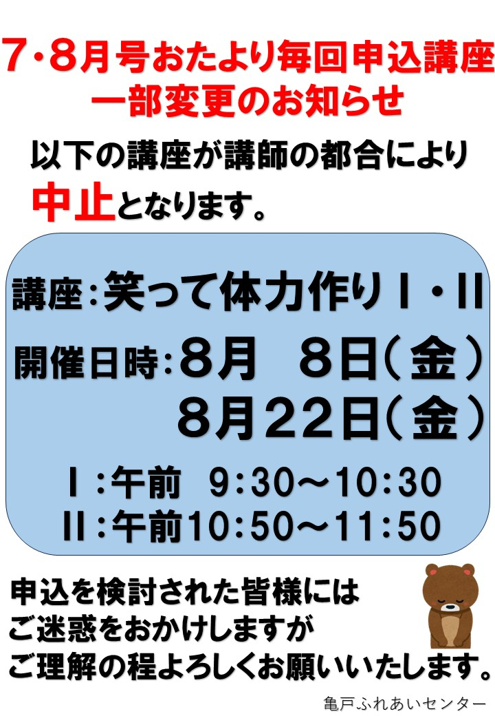7・8月号おたより一部講座中止のお知らせ【笑って体力作り】