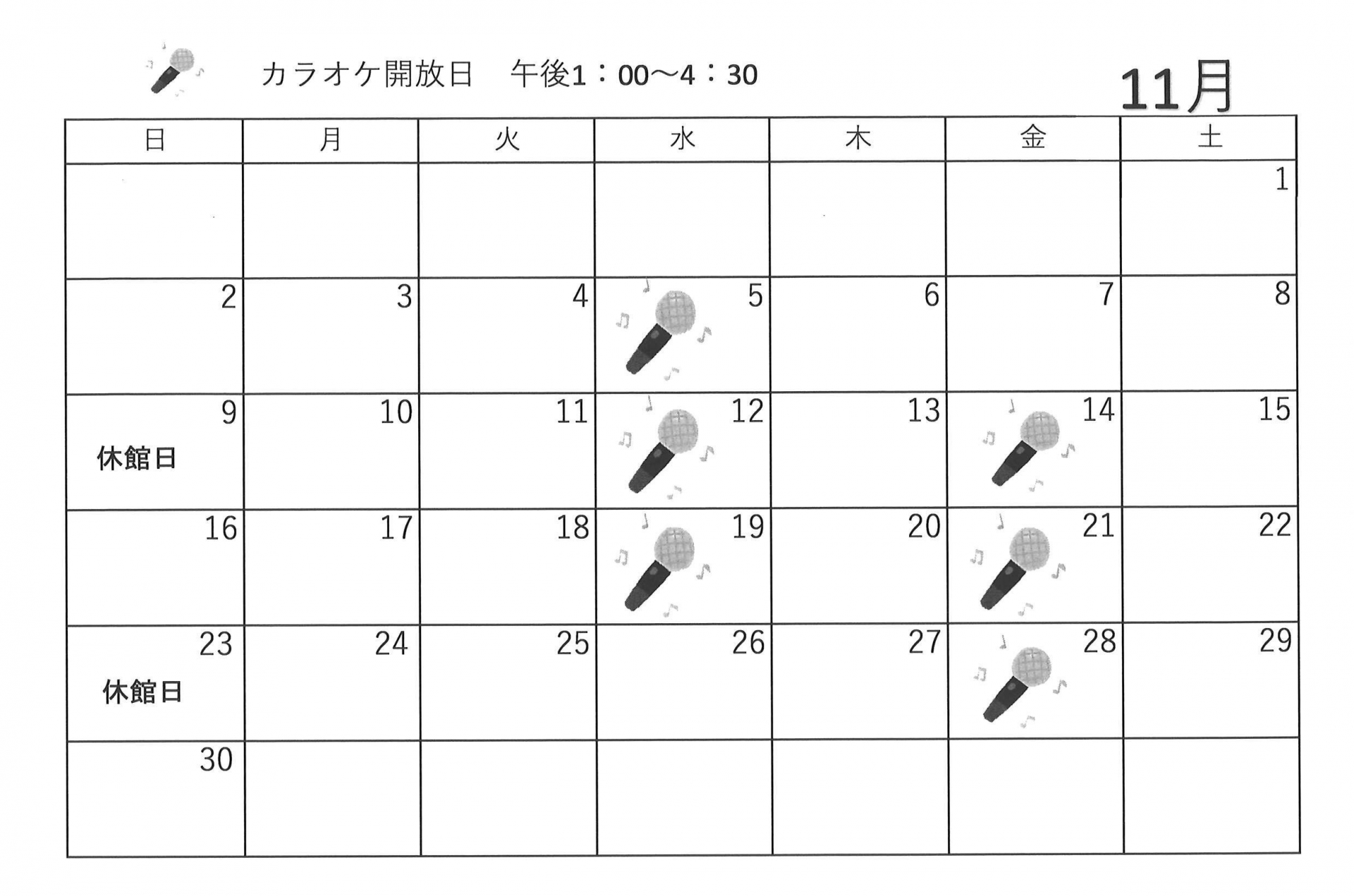 11月開催【ゆうゆう体操、カラオケ自由開放、卓球自由開放】日程表のお知らせです。