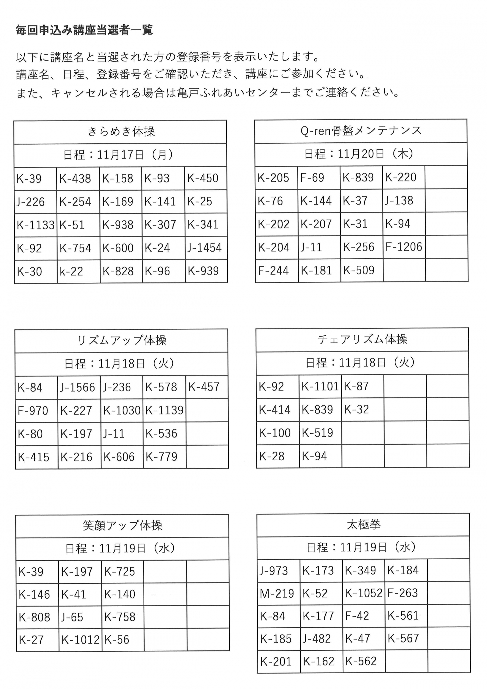 11月後半開催の毎回申込み講座の当選発表をいたします。