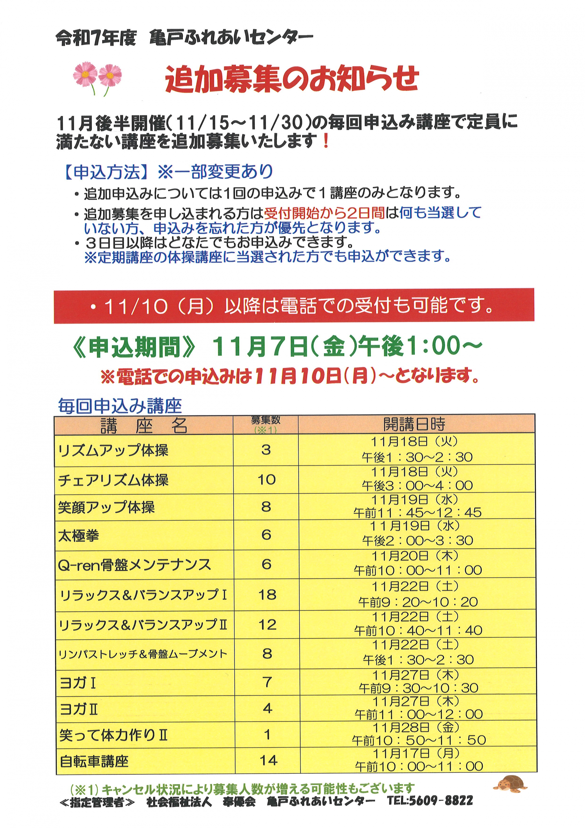 11月後半開催の毎回申込講座で定員に満たなかった講座の追加募集を行います。追加募集する講座は以下の講座となります。