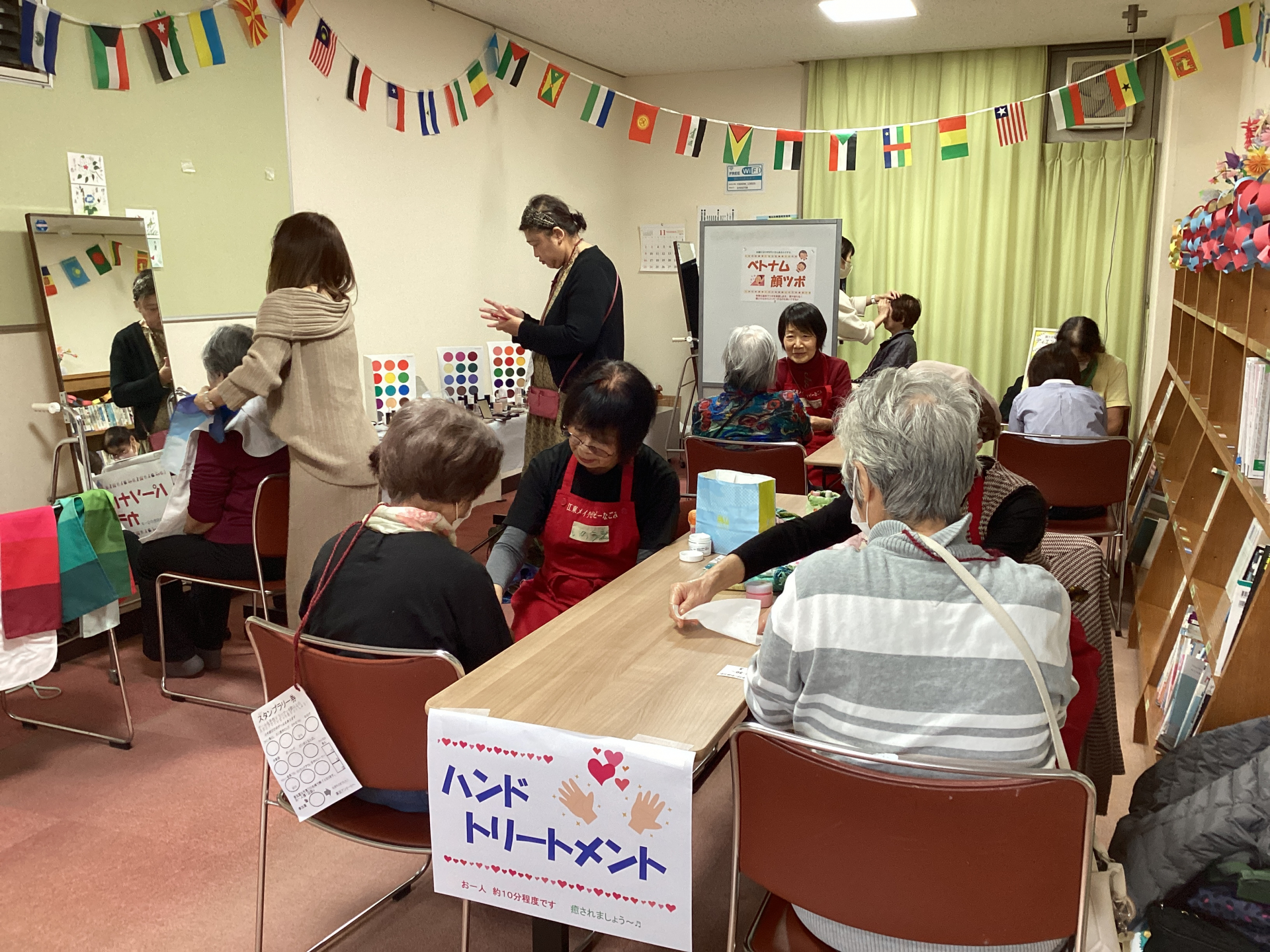令和7年11月8日(土)午前10時から恒例のにこにこ秋まつりを開催しました。今回は~癒しのコーナー~のようすをご紹介します。ハンドトリートメント当日先着20名、パーソナルカラー当日先着10名、ベトナム顔ツボ当日先着午前・午後各8名の方々に体験していただきました。