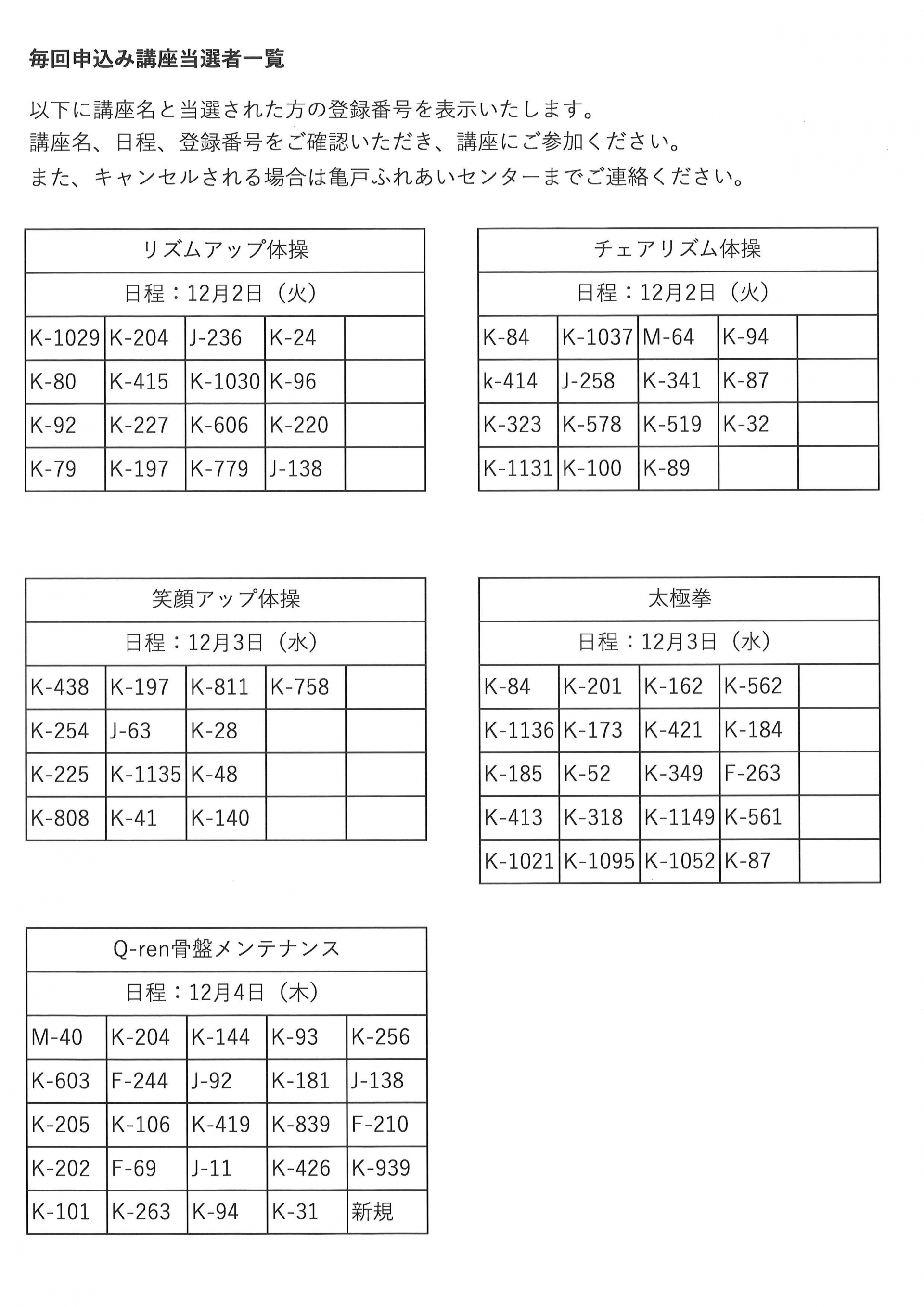12月前半開催の毎回申込み講座の当選発表をいたします。