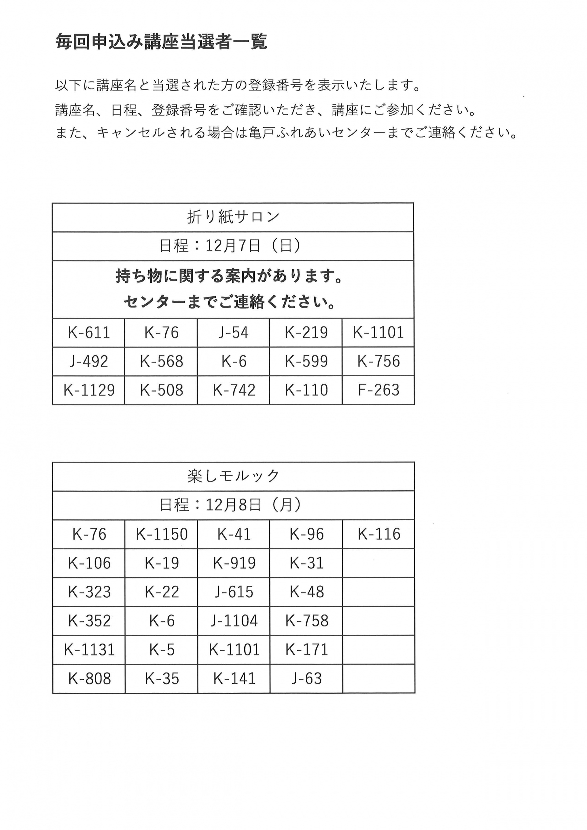 12月前半開催の毎回申込み講座の当選発表をいたします。