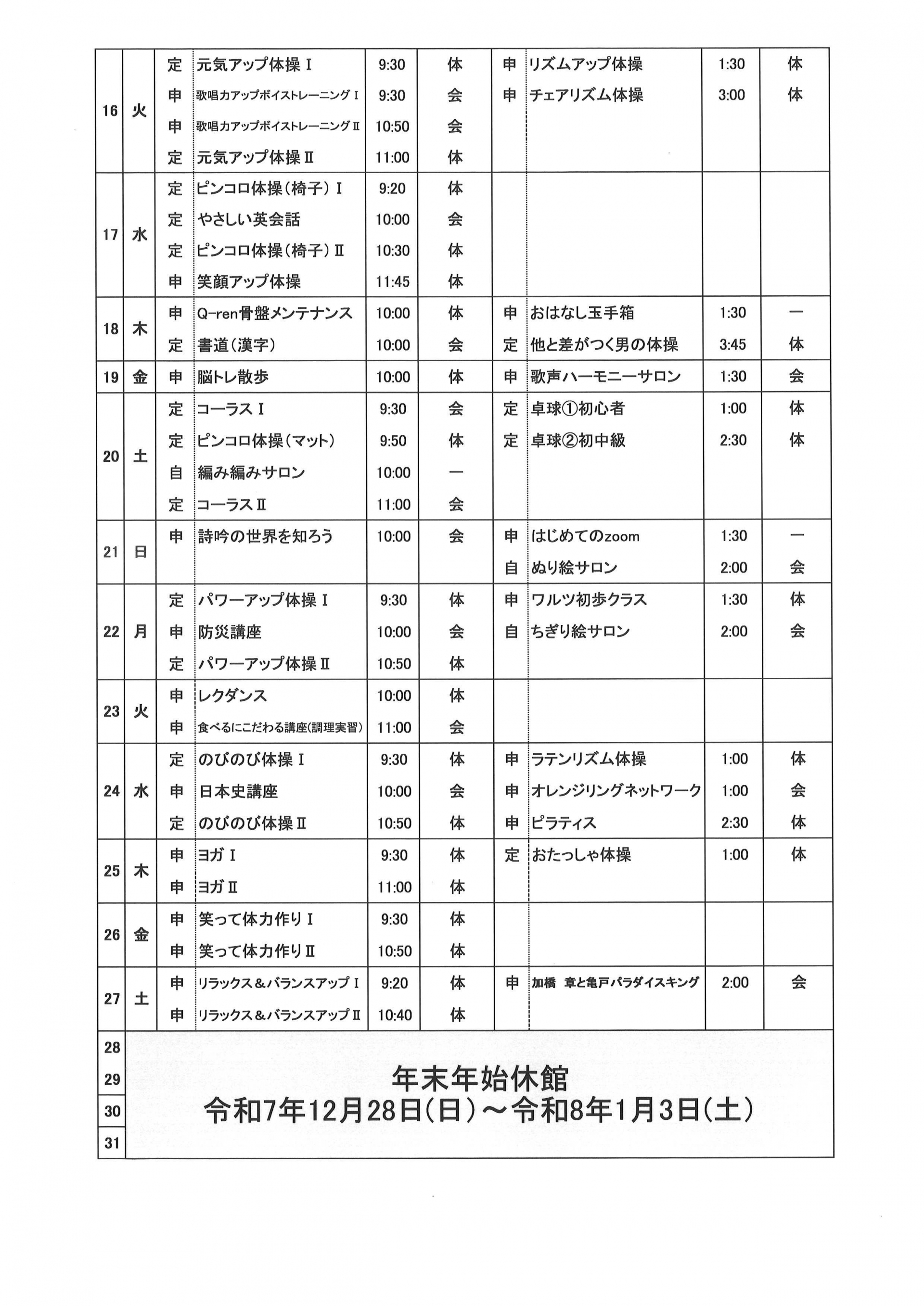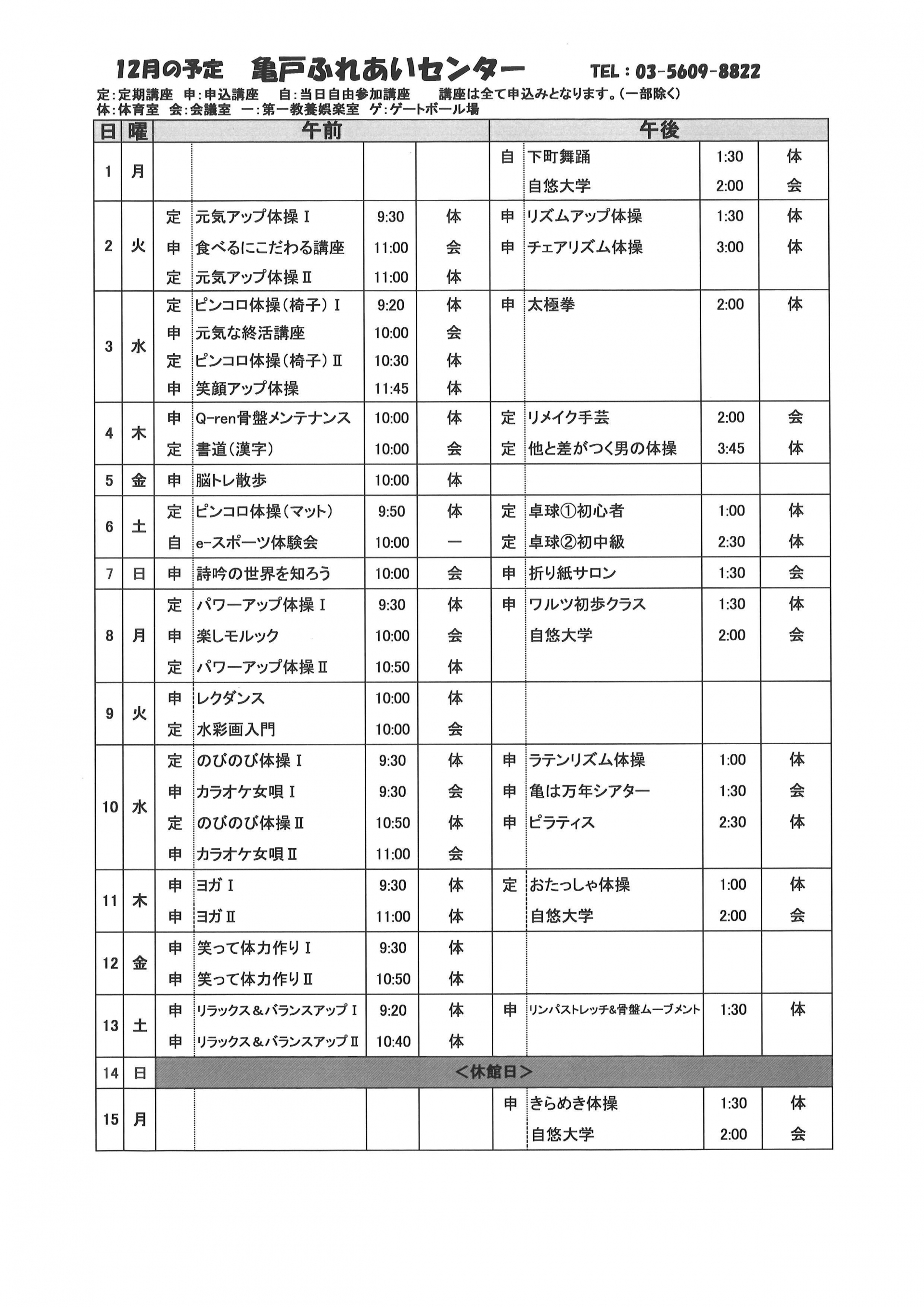 2025.11.25 お知らせ 2025年亀戸ふれあいセンター12月号予定表 Tweet シェアする 2025年亀戸ふれあいセンター12月号予定表が完成しました。 亀戸ふれあいセンター F.A 前の記事 2025.11.25 お知らせ 12月自由参加日程表【ゆうゆう体操、カラオケ自由開放、卓球自由開放】 次の記事 2025.11.25 お知らせ 2025年亀戸ふれあいセンター12月号おたより 一覧へ戻る