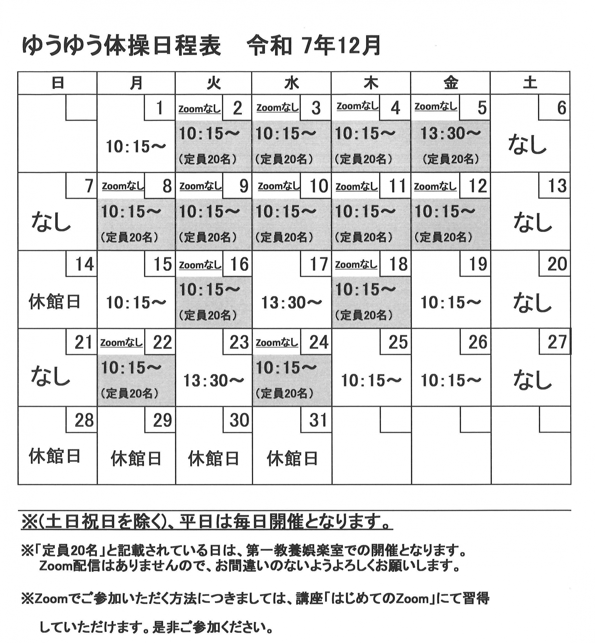 ①ゆうゆう体操は、(土日祝日除く)平日は毎日開催となります。