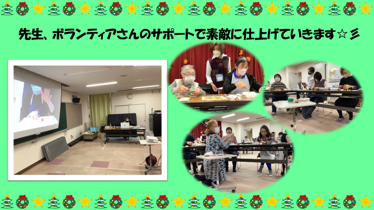 ねんどサロンが開催されました。今回は「スウィーツみたいなクリスマスリース」を作りました!講師は、ねんどアートインストラクターのもり やす子氏です。毎回丁寧に教えて下さり、今回も皆さん楽しそうに作成されました。初めての方でも安心!ボランティアさんが各テーブルに1名ついて下さいます♪少し迷ってしまったときなどに優しくサポートをしてくださいます!