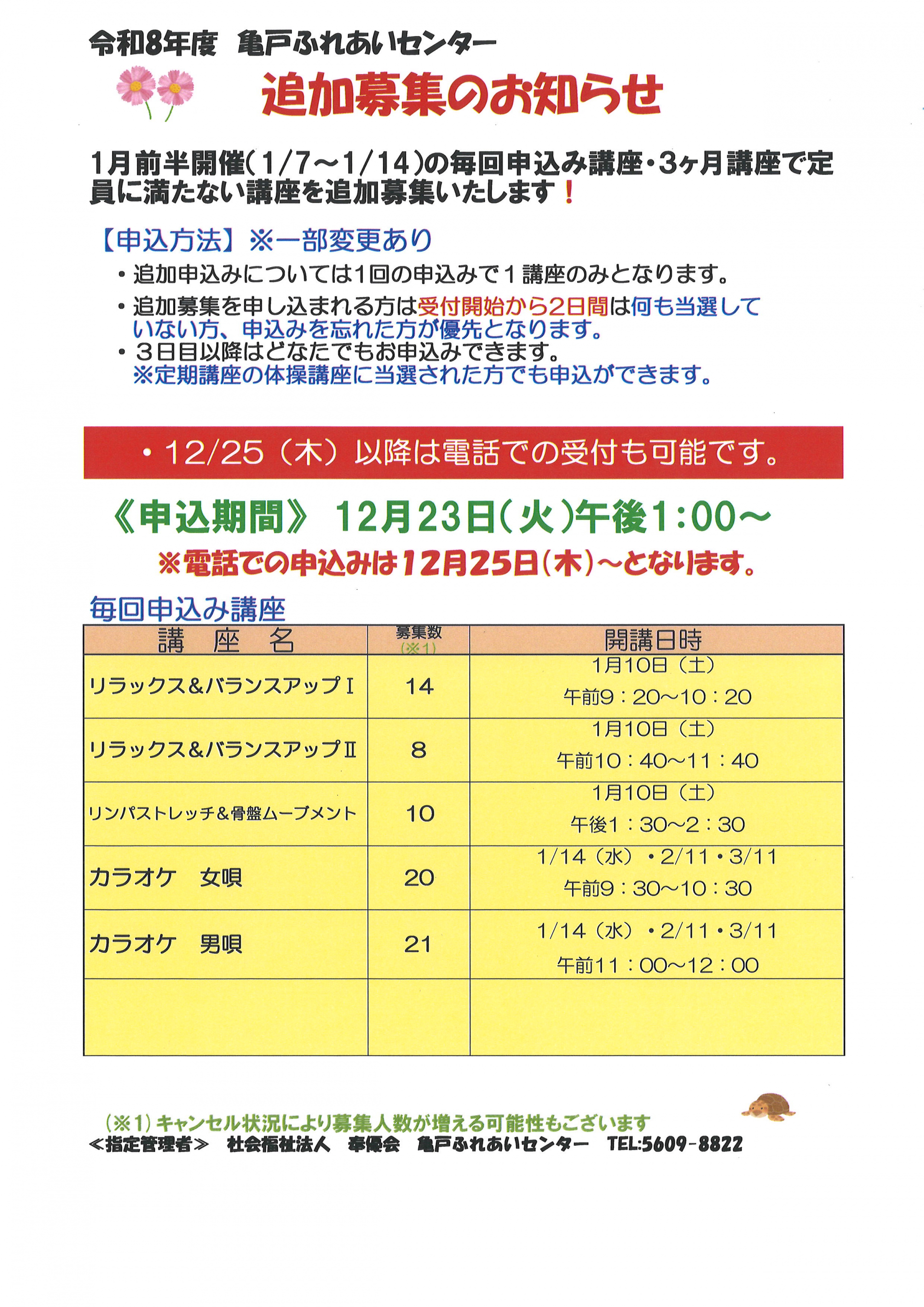 1月前半開催の毎回申込講座・3ヶ月講座で定員に満たなかった講座の追加募集を行います。追加募集する講座は以下の講座となります。