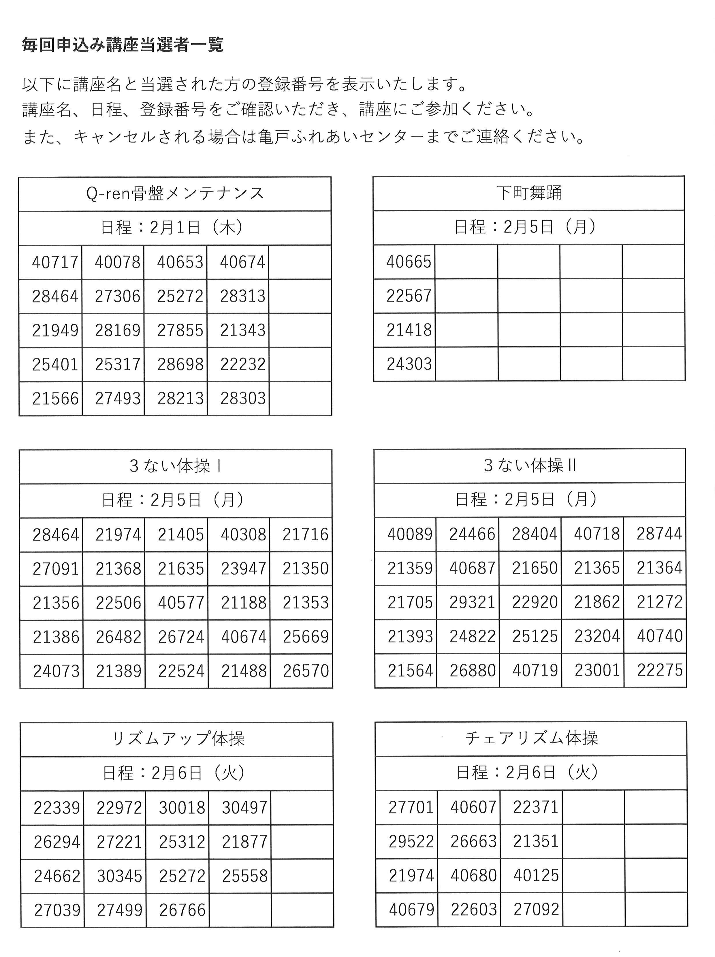 2月前半開催の毎回申込み講座の当選発表をいたします。