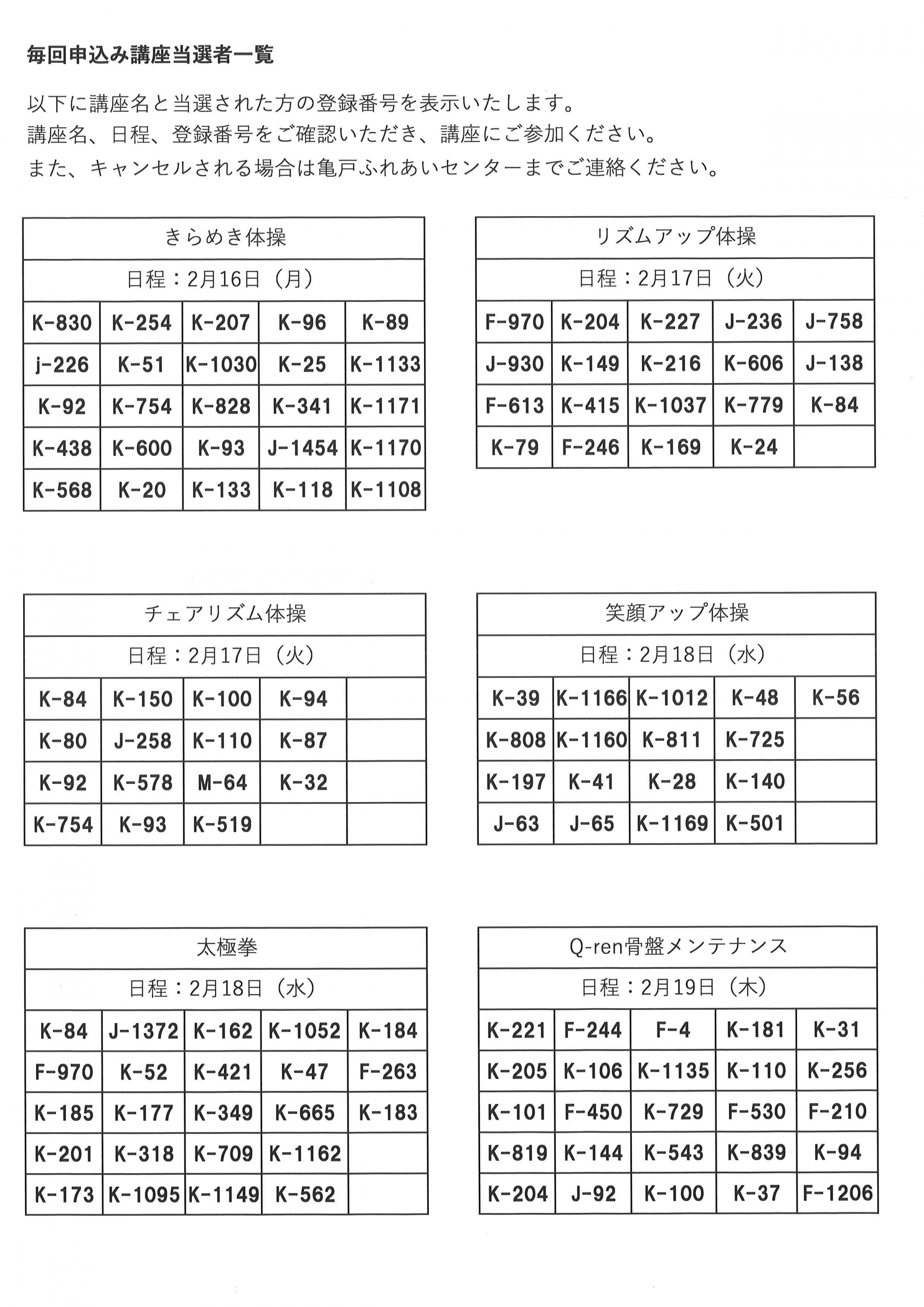 2月後半開催の毎回申込み講座の当選発表