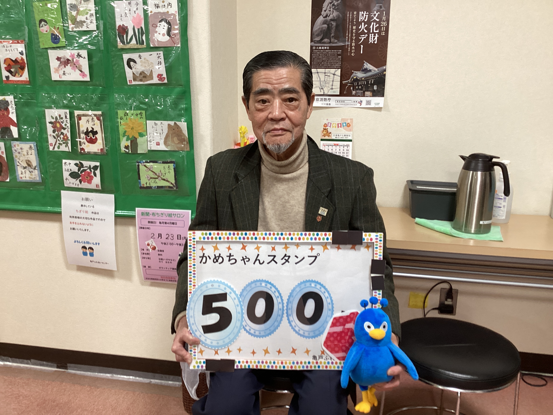 亀戸ふれあいセンター来館時のお楽しみ、かめちゃんスタンプ500個達成されましたY.K様です。