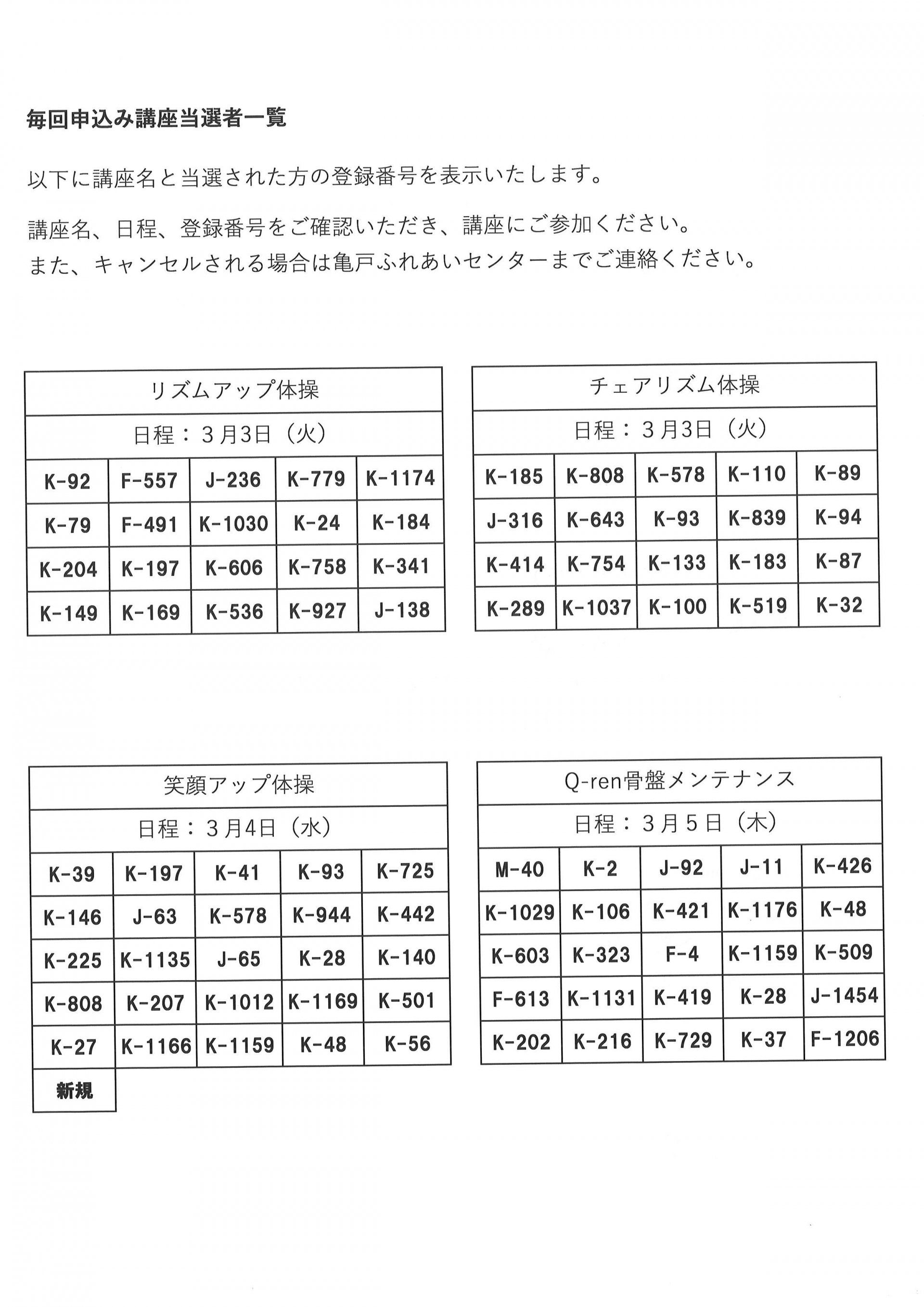 3月前半開催の毎回申込み講座の当選発表