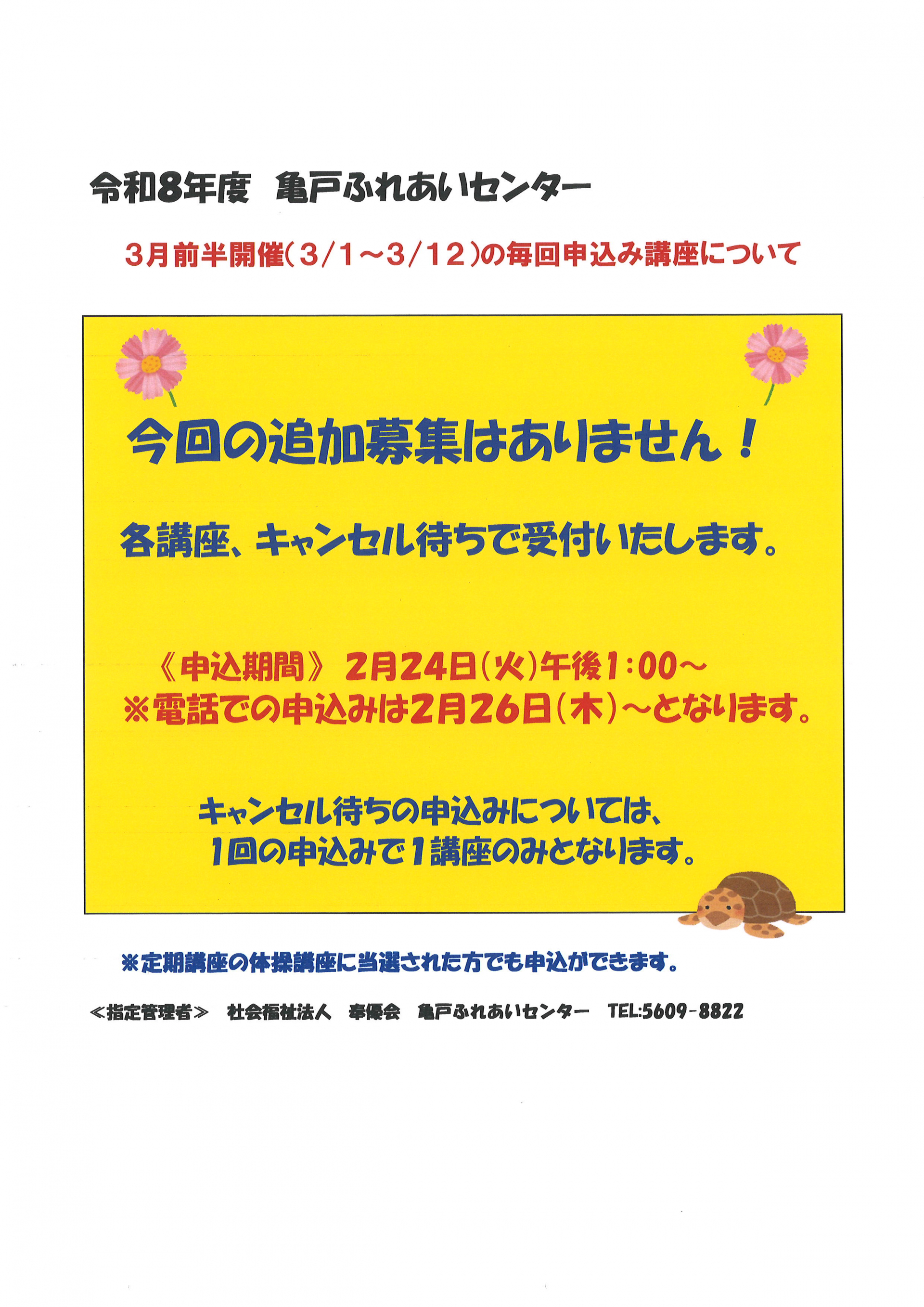 2026.02.23 お知らせ 3月前半毎回申込講座 追加募集のご案内 Tweet シェアする 3月前半の毎回申込み講座の追加募集はありません。キャンセル待ちのみとなります。 亀戸ふれあいセンター K.T 前の記事 2026.02.25 お知らせ 3月自由参加日程表【ゆうゆう体操、カラオケ自由開放、卓球自由開放】 次の記事 2026.02.23 お知らせ 3月前半毎回申込講座 当選連絡その2【その他の講座】 一覧へ戻る