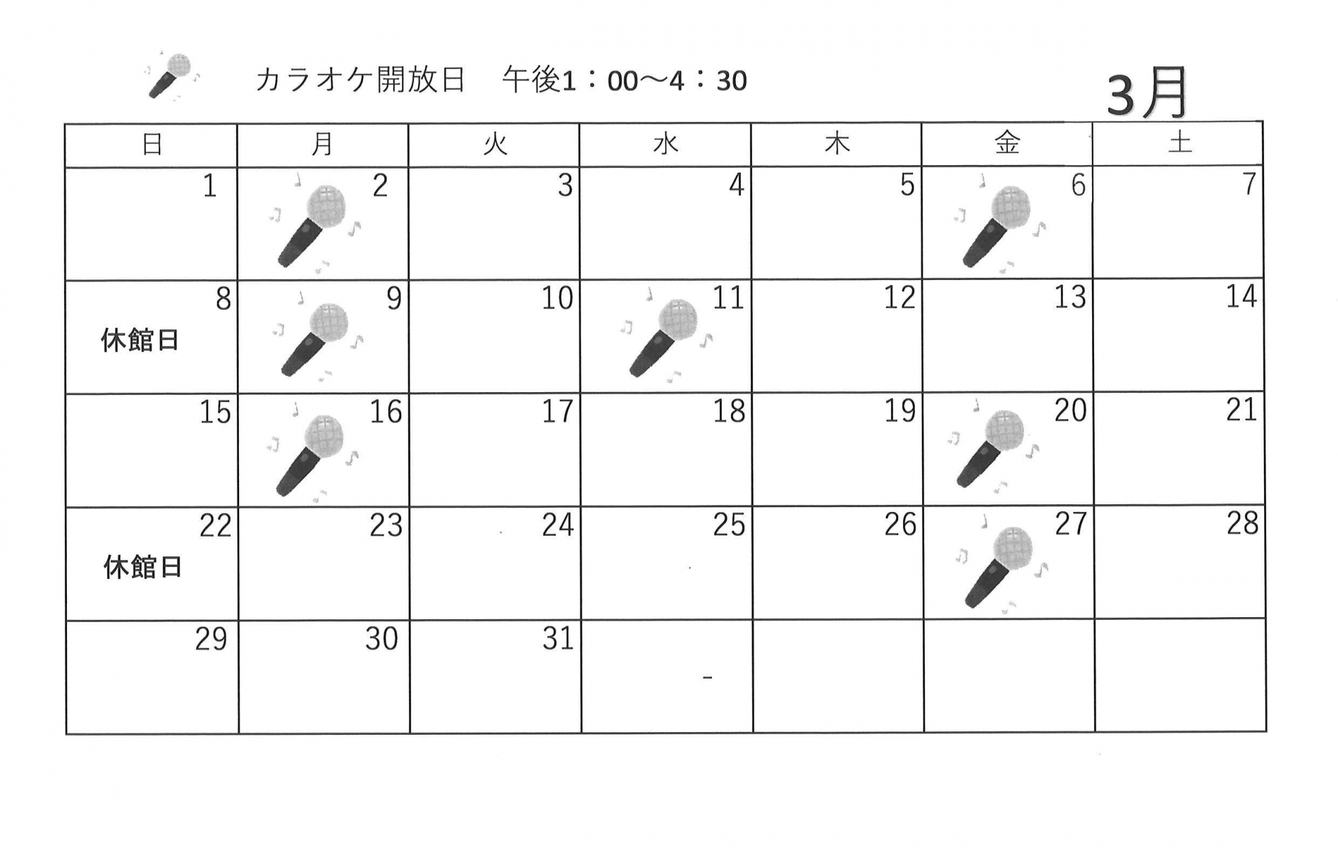 3月開催【ゆうゆう体操、カラオケ自由開放、卓球自由開放】日程表のお知らせです。