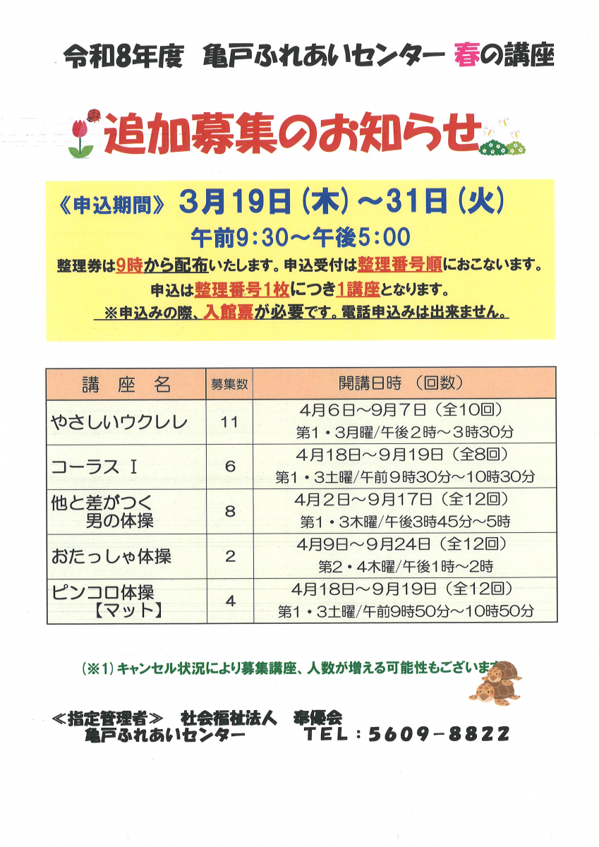 2026.03.11 お知らせ R8年 春の定期講座の追加募集 Tweet シェアする 令和8年度春の定期講座で定員に満たなかった講座の追加募集を行います。追加募集する講座は以下の講座となります。 亀戸ふれあいセンター K.T 次の記事 2026.03.10 お知らせ 令和8年度 春の定期講座(4月~9月)の当選連絡のお知らせ 一覧へ戻る