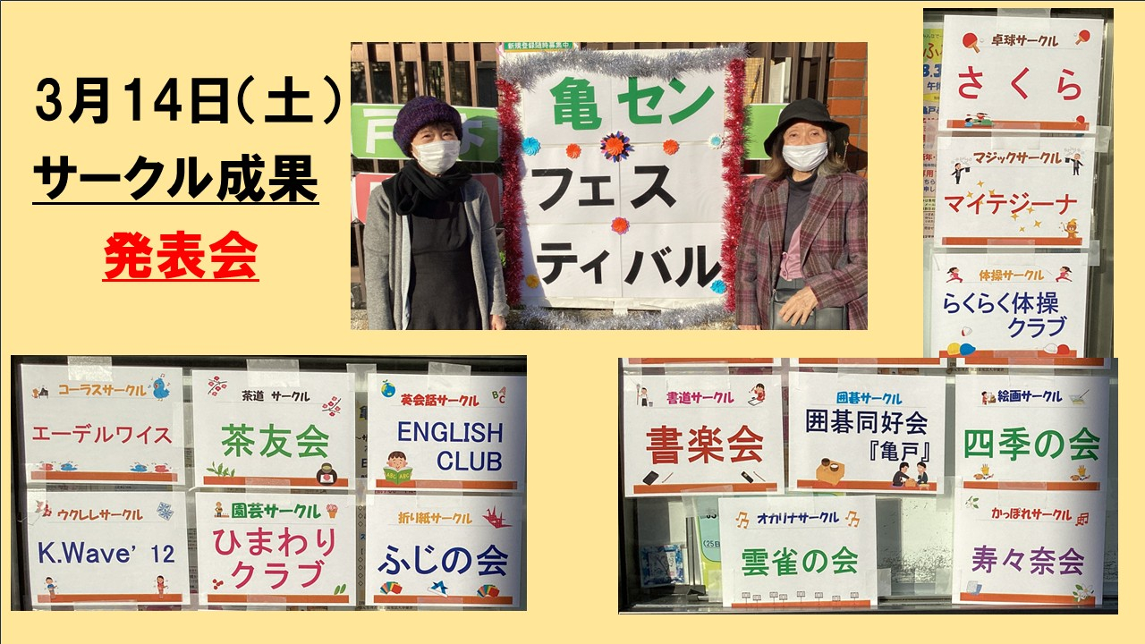 令和7年度、亀戸ふれあいセンターで練習を重ねている各サークルの1年間の成果を発表する会、亀センフェスティバルが3月14日(土)に開催しました。午前中に茶道(茶友会)の茶会が3席開催しました、作品展示は3サークル、折り紙(ふじの会)・水彩画(四季の会)・書道(書楽会)です。ステージ発表は7サークル、英会話(ENGLISH CLUB)・マジック(マイテジーナ)・コーラス(エーデルワイス)・オカリナ(雲雀の会)・ウクレレ(K.Wave’12)・(らくらく体操クラブ)・かっぽれ(寿々奈会)です。他4サークルはサークル紹介のみでの参加です、以上全15サークルがあります。お茶会、展示、ステージの順に当日の様子を紹介させていただきます。