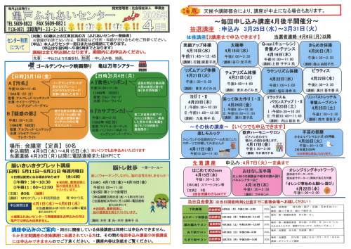 2026.03.25 お知らせ 2026年亀戸ふれあいセンター4月号予定表 Tweet シェアする 2026年亀戸ふれあいセンター4月号予定表が完成しました。 亀戸ふれあいセンター F.A 前の記事 2026.03.26 お知らせ 4月自由参加日程表【ゆうゆう体操、カラオケ自由開放、卓球自由開放】 次の記事 2026.03.25 お知らせ 2026年亀戸ふれあいセンター4月号おたより 一覧へ戻る