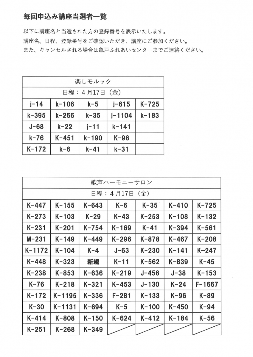 4月後半開催の毎回申込み講座の当選発表をいたします。