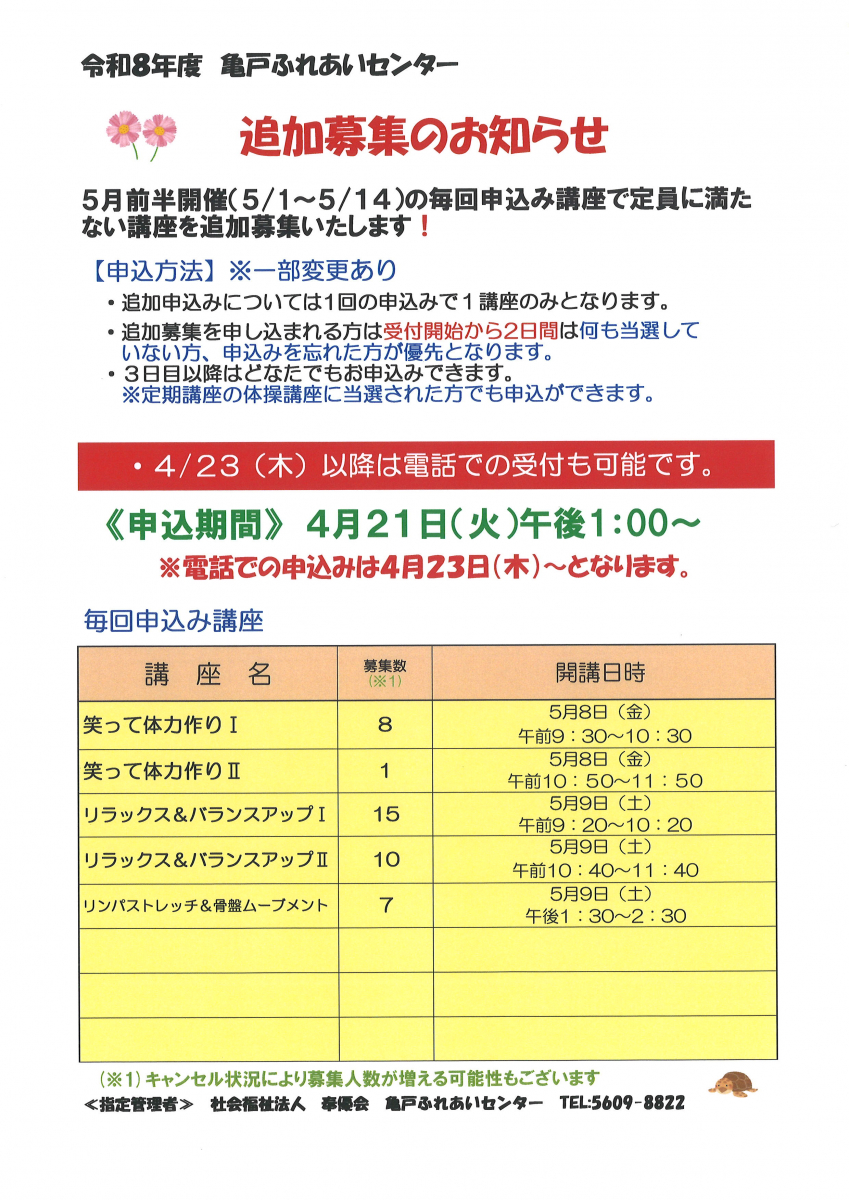 5月前半開催の毎回申込講座で定員に満たなかった講座の追加募集を行います。追加募集する講座は以下の講座となります。